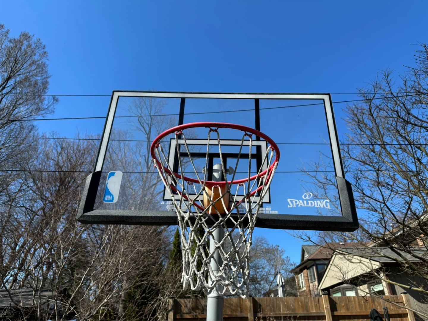 This Spalding portable basketball hoop features a clear backboard and a durable net. The pole is adjustable from 7.5 - 10 ft and the base can be filled with water or sand for stability. It's great for backyard games and practice!