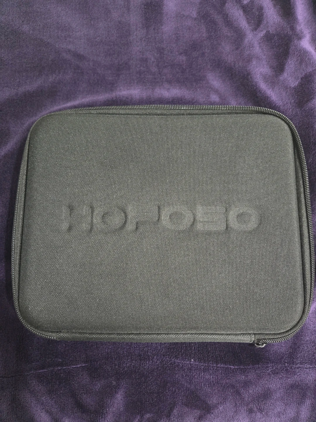 HOPOOS massage gun in a zippered carrying case. Includes various massage heads and charger. Great for post-workout recovery!