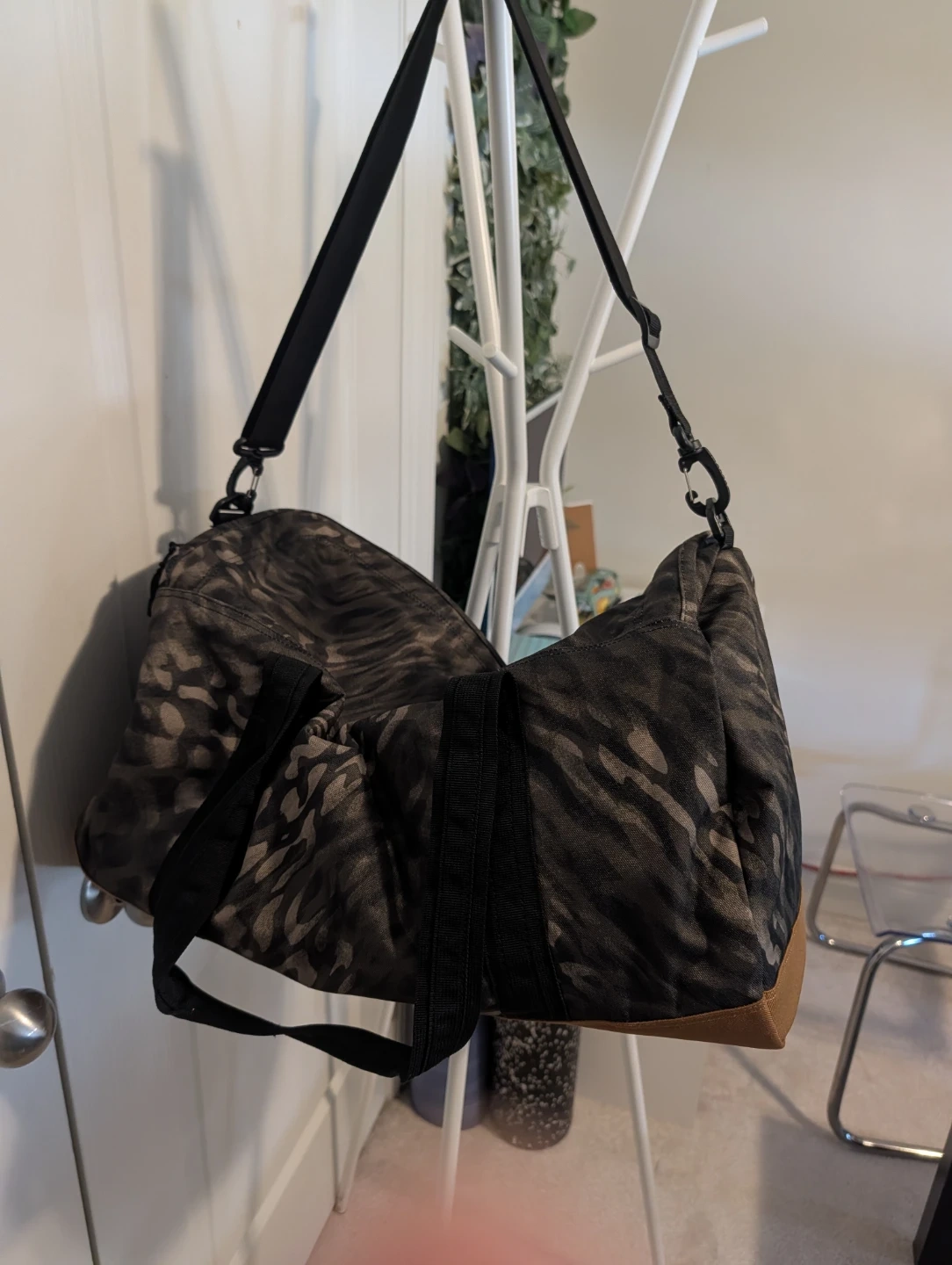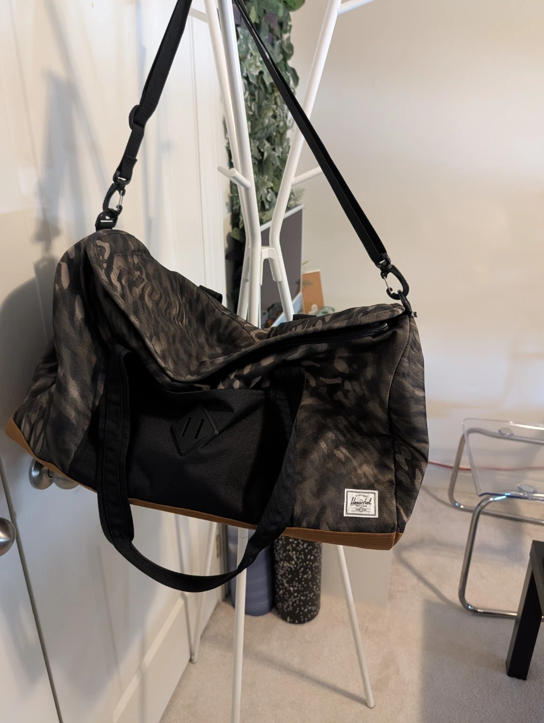 Herschel duffle bag with a cool animal print pattern. It has dual carry handles and a detachable shoulder strap. Perfect for weekend trips or the gym!