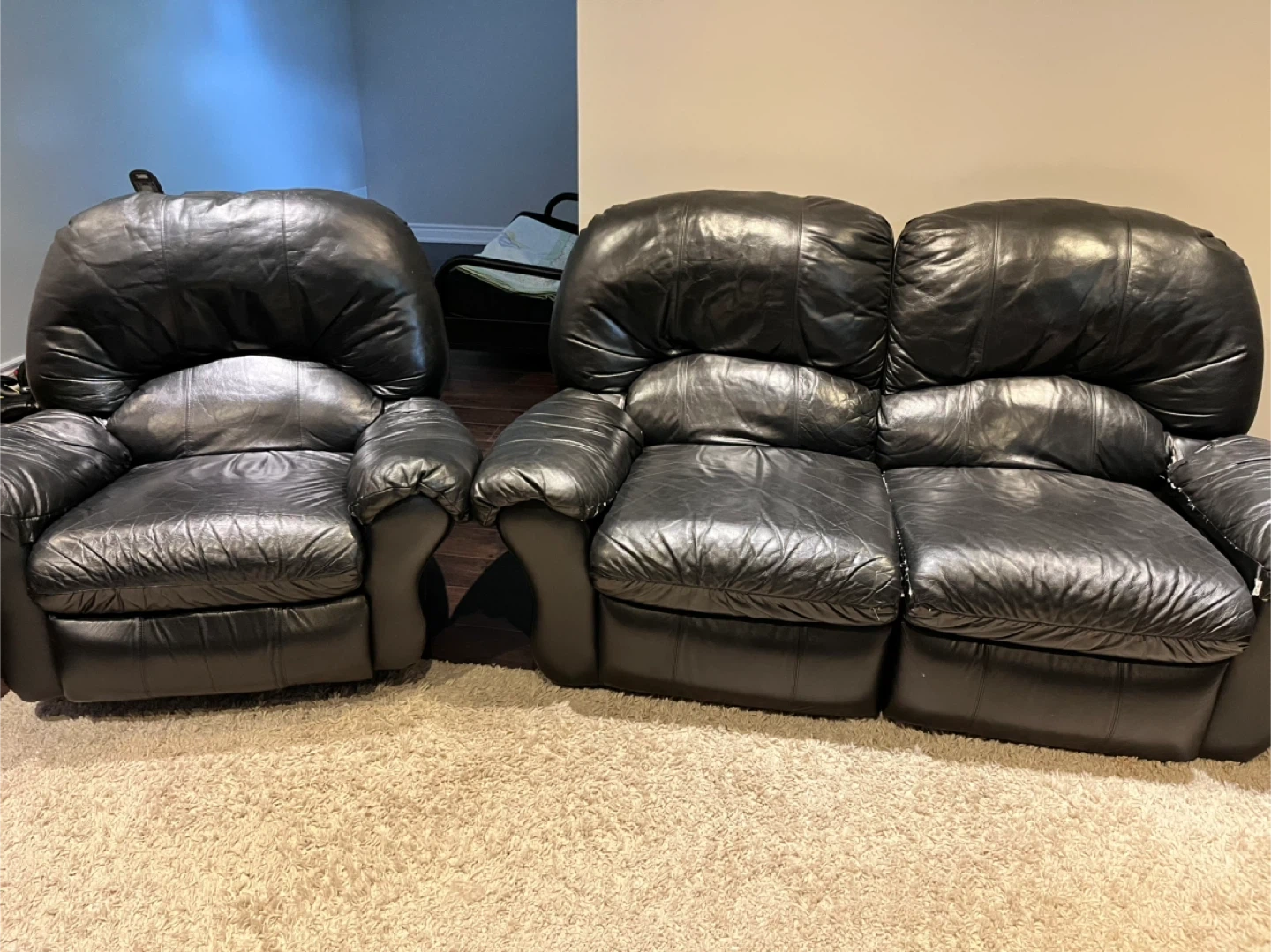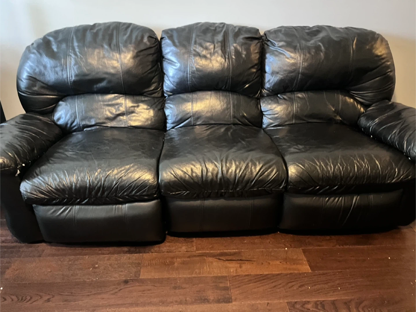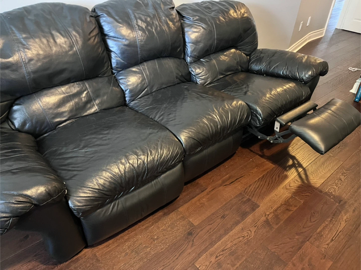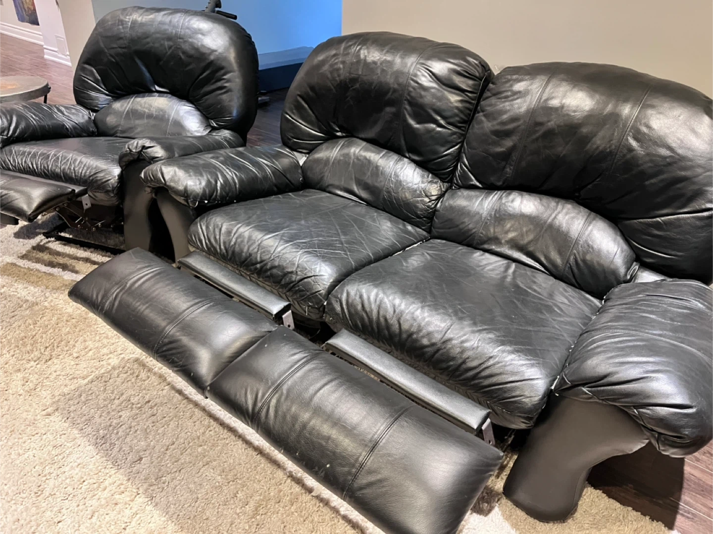 Comfortable black leather reclining sofa and matching armchair. The sofa has three seats, and the armchair has one seat. All seats recline with extendable footrests. Leather material.
