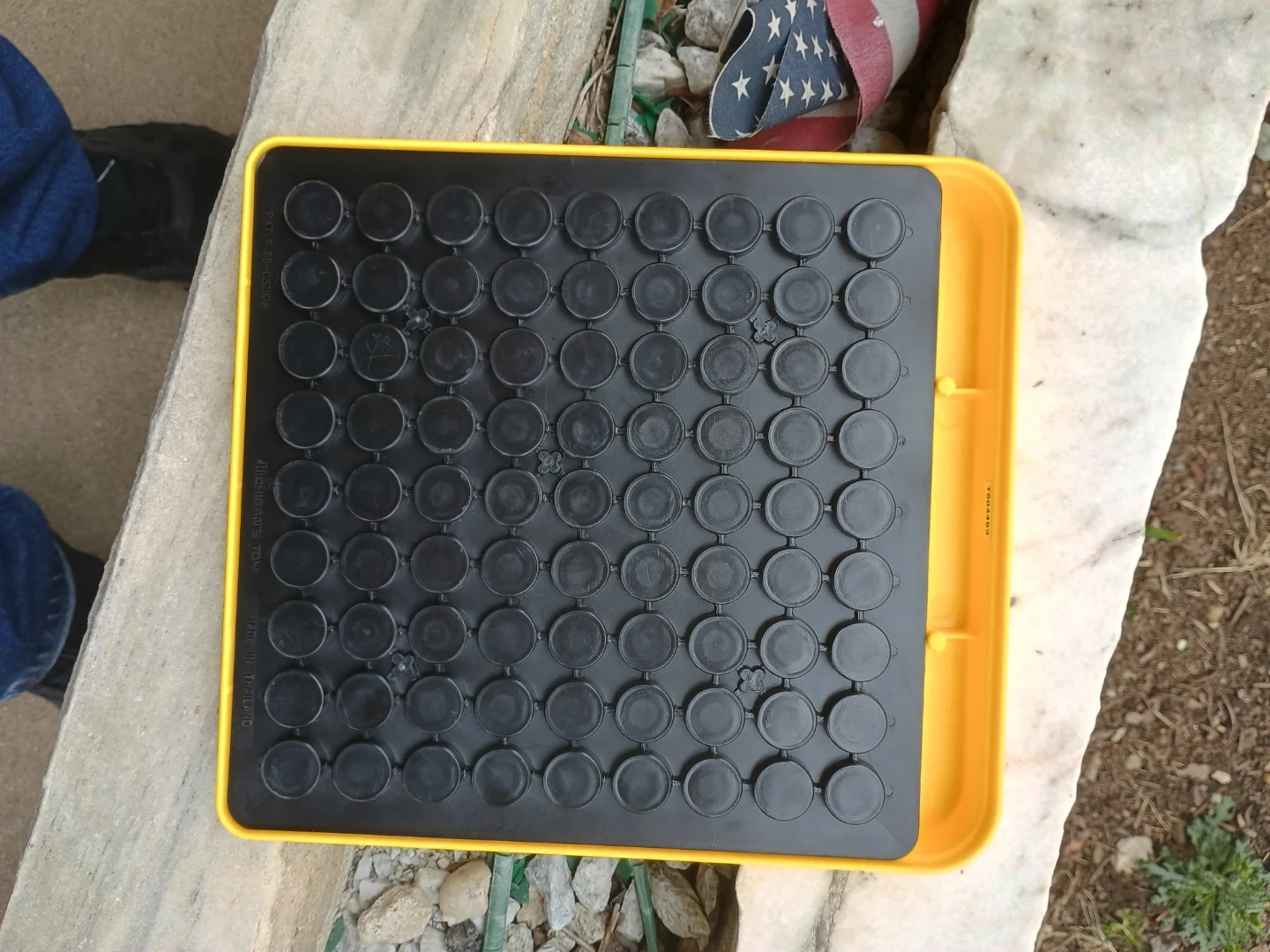 This is a Lakeshore Multiplication Machine. It's yellow and features a multiplication grid on the front. The back has black circular pegs for practice.