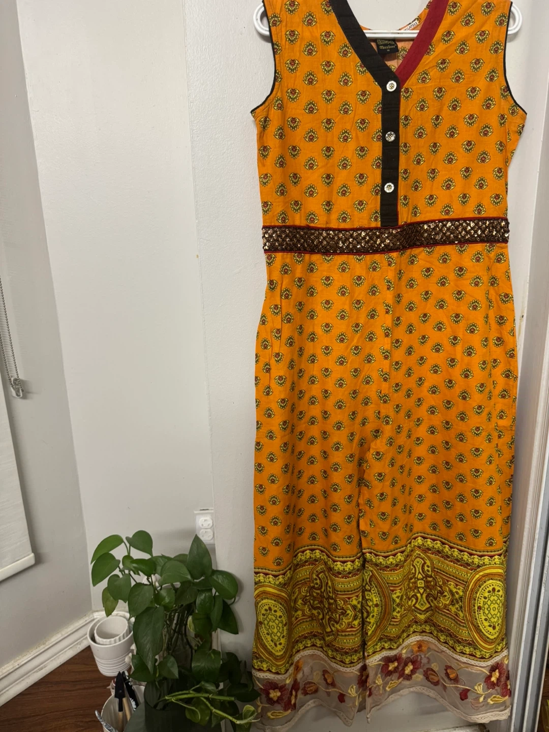 This MissSoni jumpsuit comes in a vibrant orange with a floral print. It features a V-neck with button details and a sequined waist accent. Size medium. Perfect for a casual day out or a stylish evening!