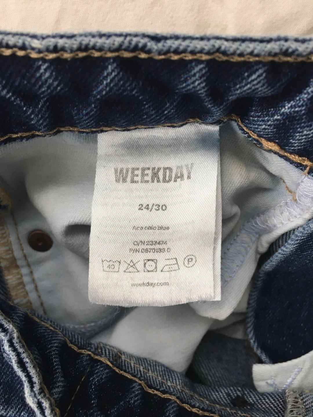 These are Weekday Ace wide leg jeans in a classic blue wash. They're a size 24/30, made from durable denim. High waisted fit.