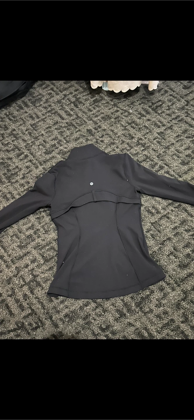 This is a Lululemon zip-up jacket in black. It's made with a comfortable, stretchy fabric perfect for workouts or casual wear. Features zippered pockets for secure storage. Zip-up style offers adjustable ventilation.