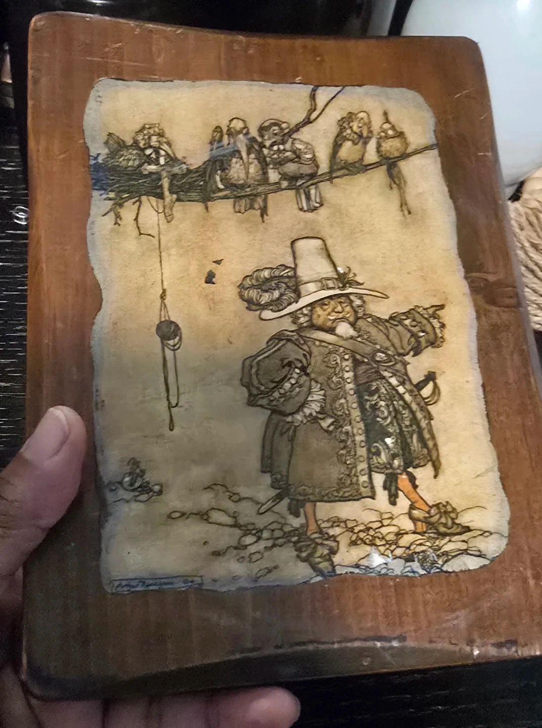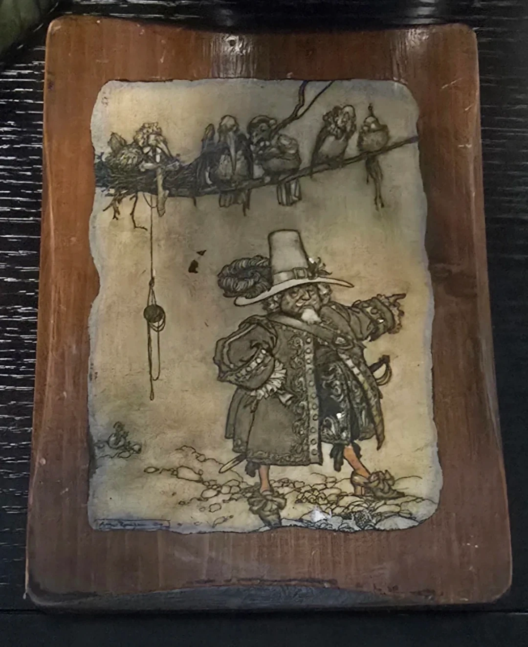 š„Selling a antique illustration art piece set in a wooden frame. Solid aged wood, It features a unique drawing of a man in historical clothing with birds in a tree. Has a signed signature bottom left. Perfect for adding a touch of vintage charm to any room! Antique plaque. It's in okay conditionš„