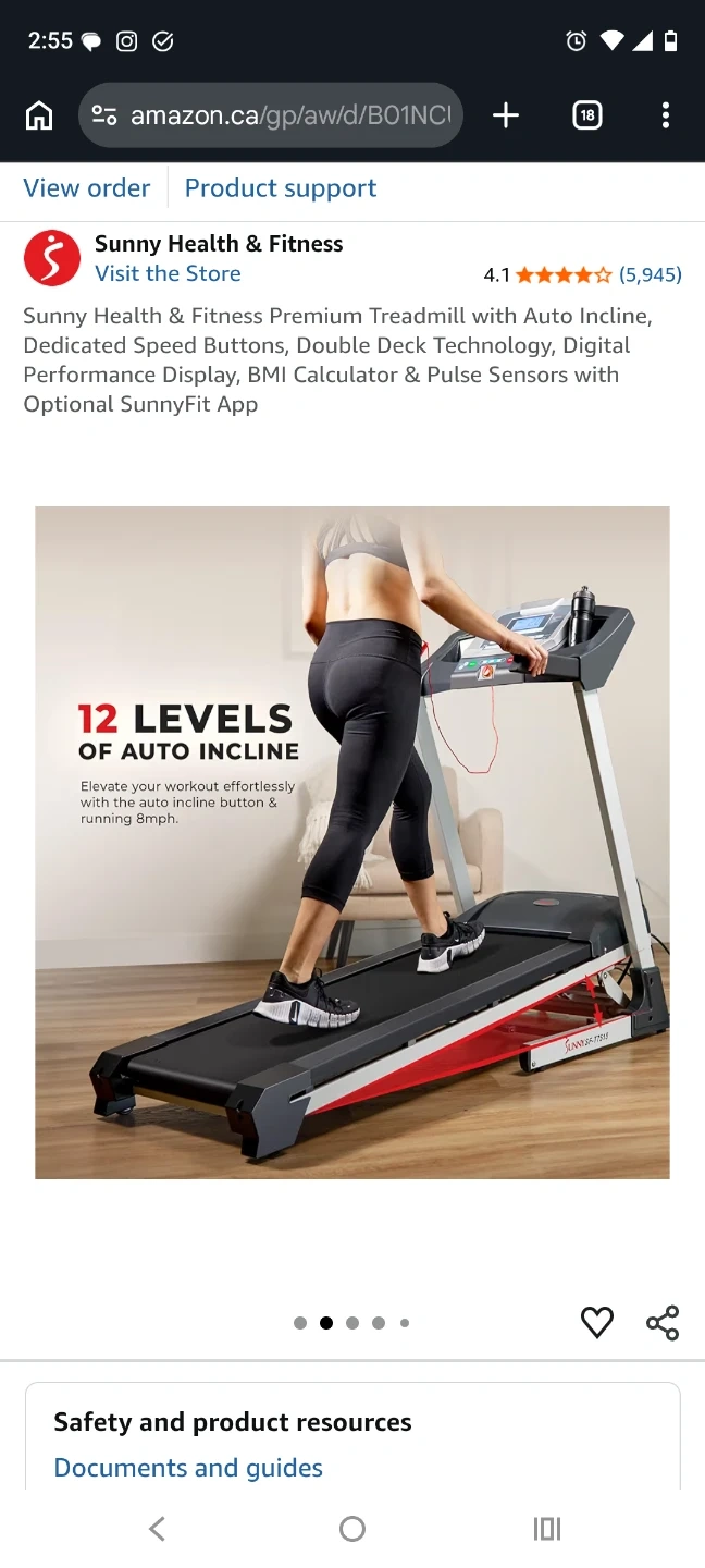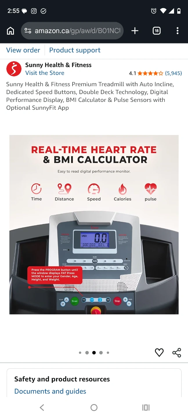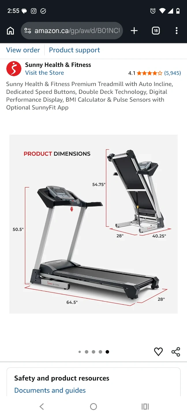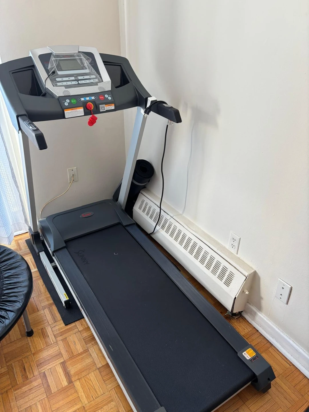 Sunny Health & Fitness treadmill with digital display. Includes auto incline and pulse sensors. Dimensions: 64.5" L x 28" W x 50.5" H.