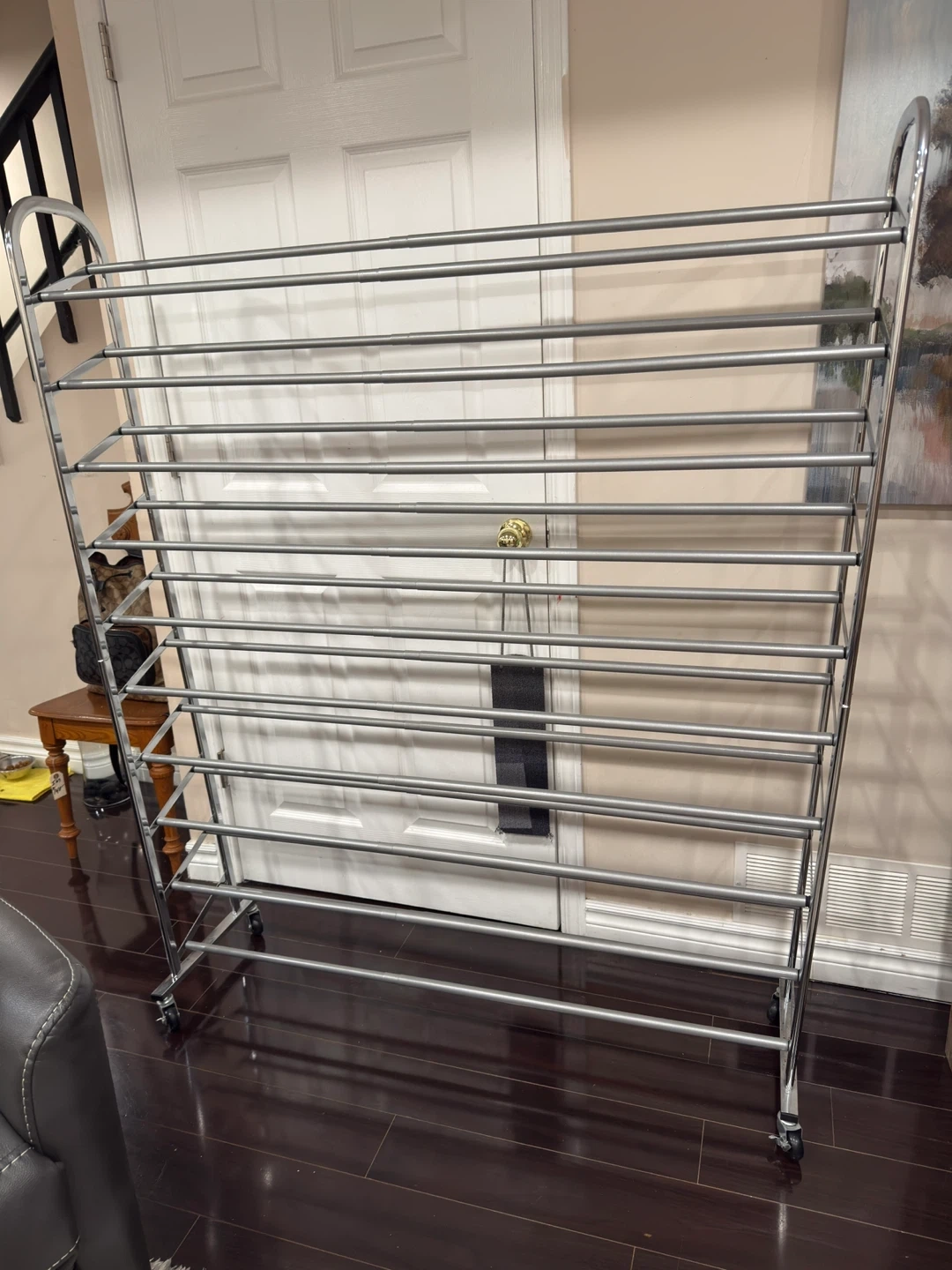 This is a 10-tier shoe rack, perfect for organizing your footwear collection. It's made of durable metal and includes wheels for easy mobility. Keep your shoes tidy and accessible!