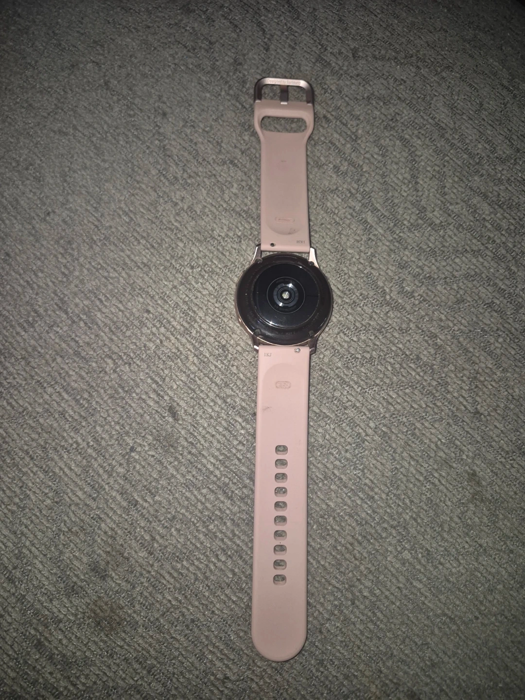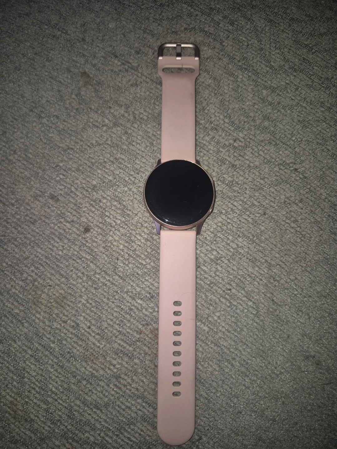 Samsung Galaxy Watch Active 2 in pink gold. It's a smartwatch with a pink band. Tracks fitness and notifications.