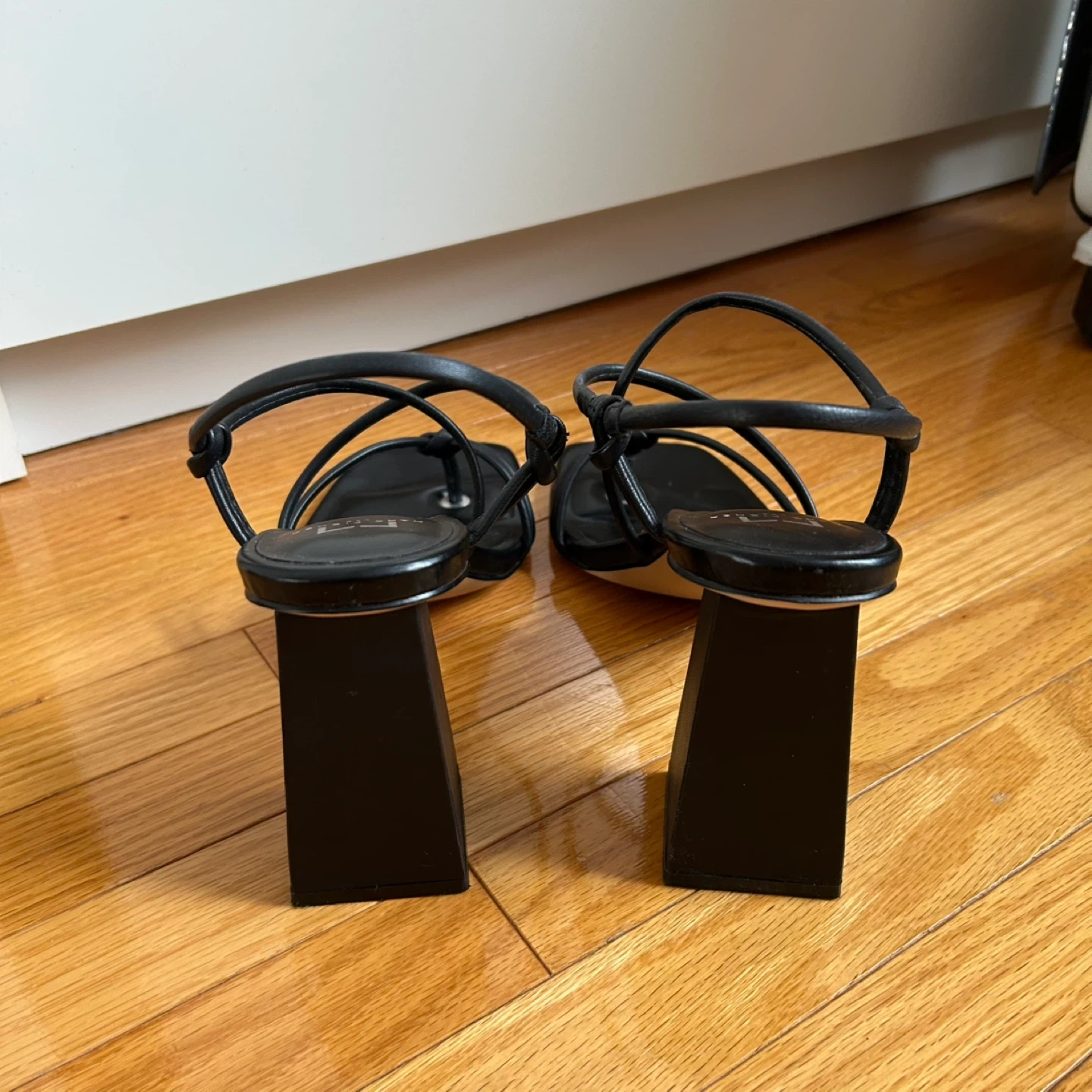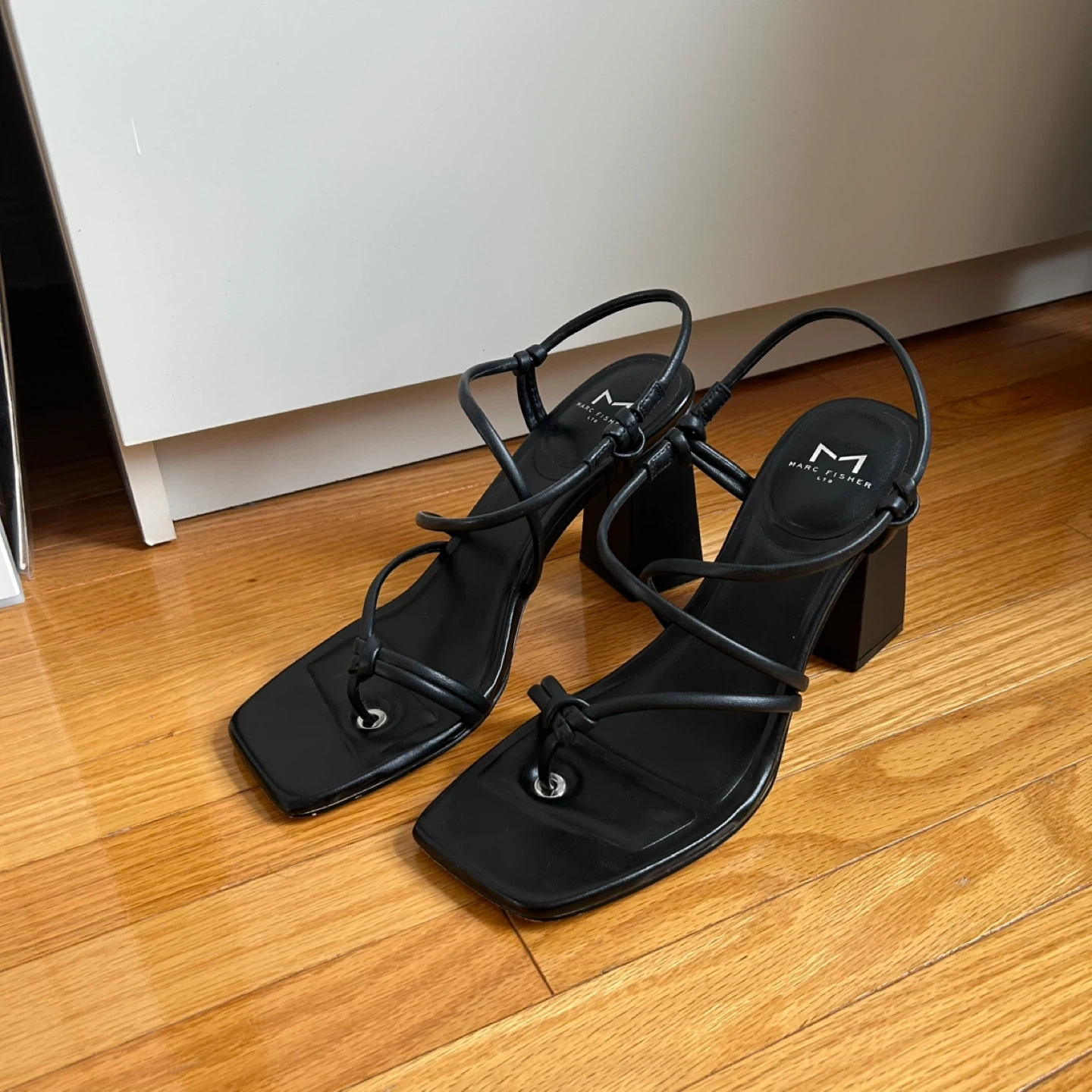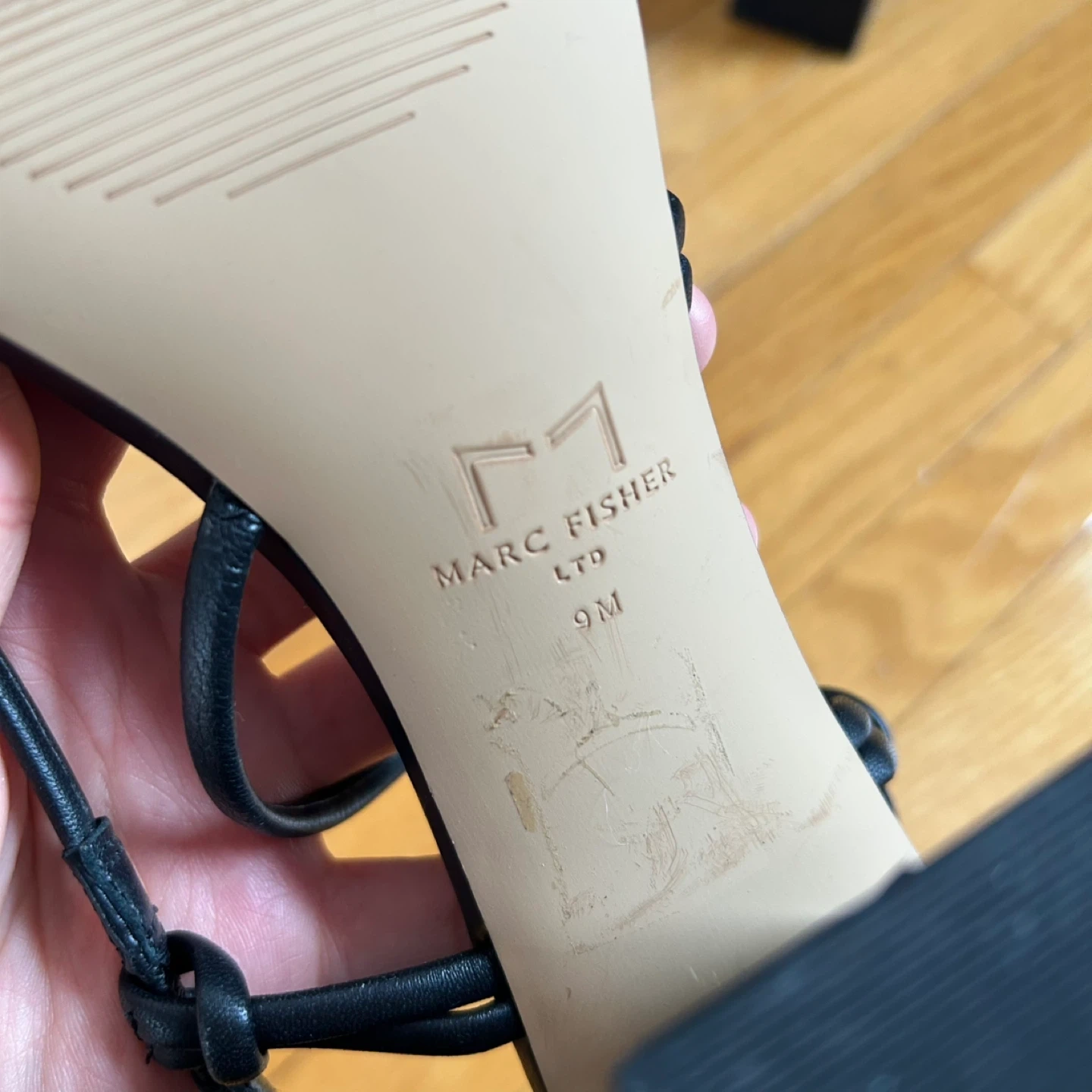 Marc Fisher black sandals with a strappy design. Features a square toe and a chunky block heel. Great for dressing up any outfit!