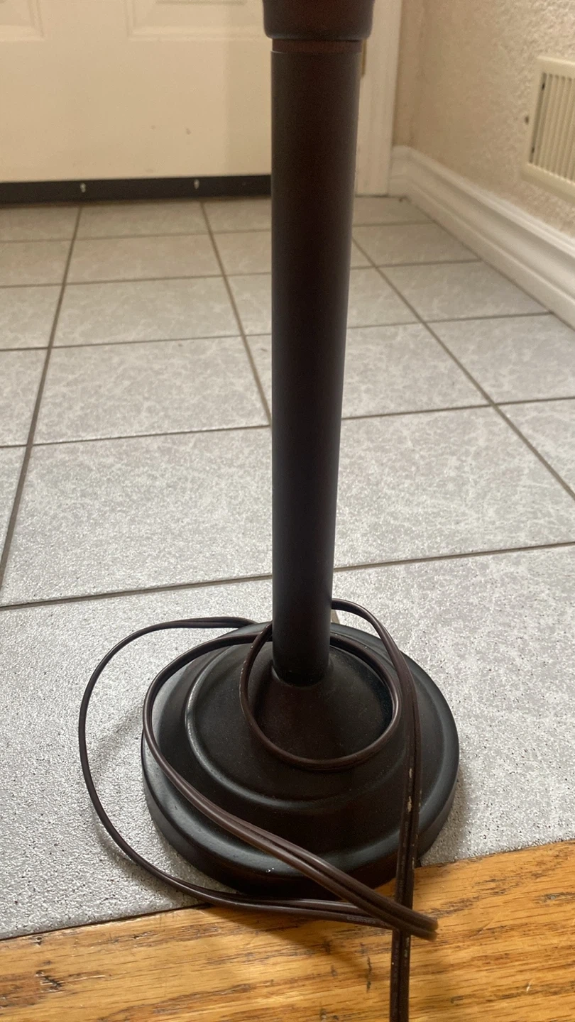 Two matching metal dark bronze colour table lamps with and off-white fabric shades. They're a classic design that would suit many decor styles. Both lamps are in good working condition.