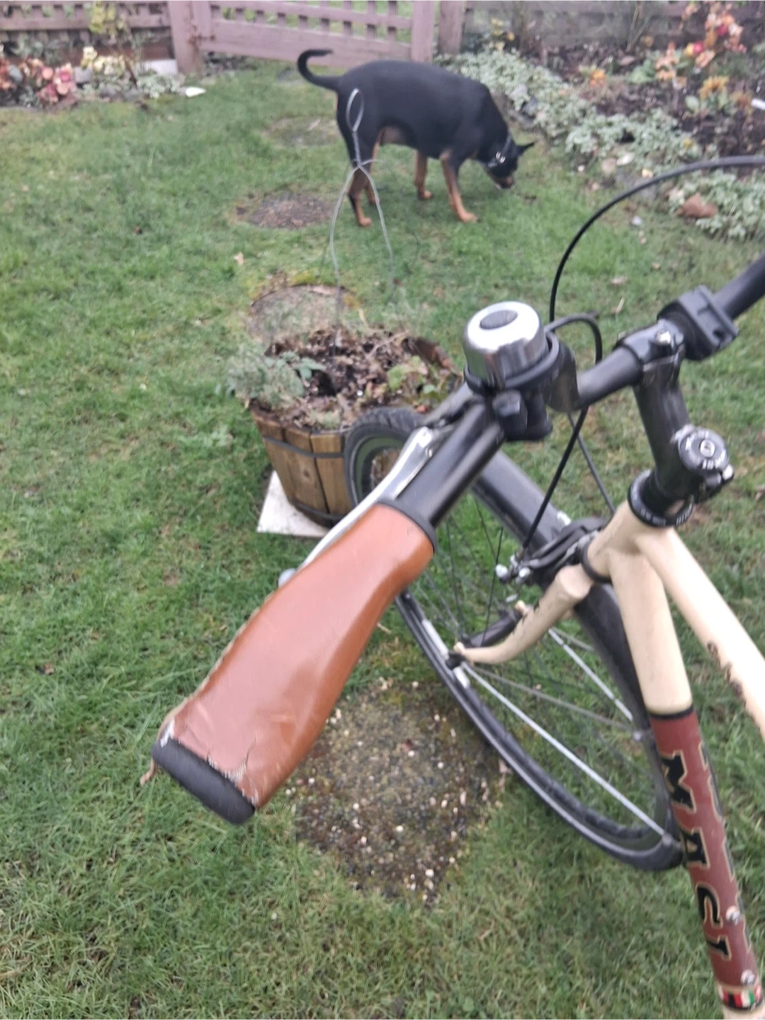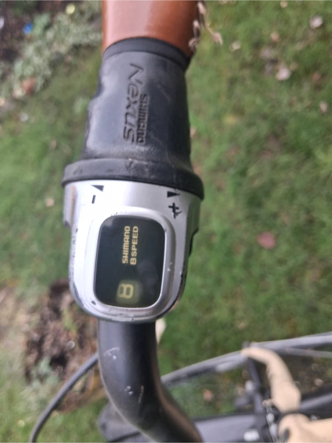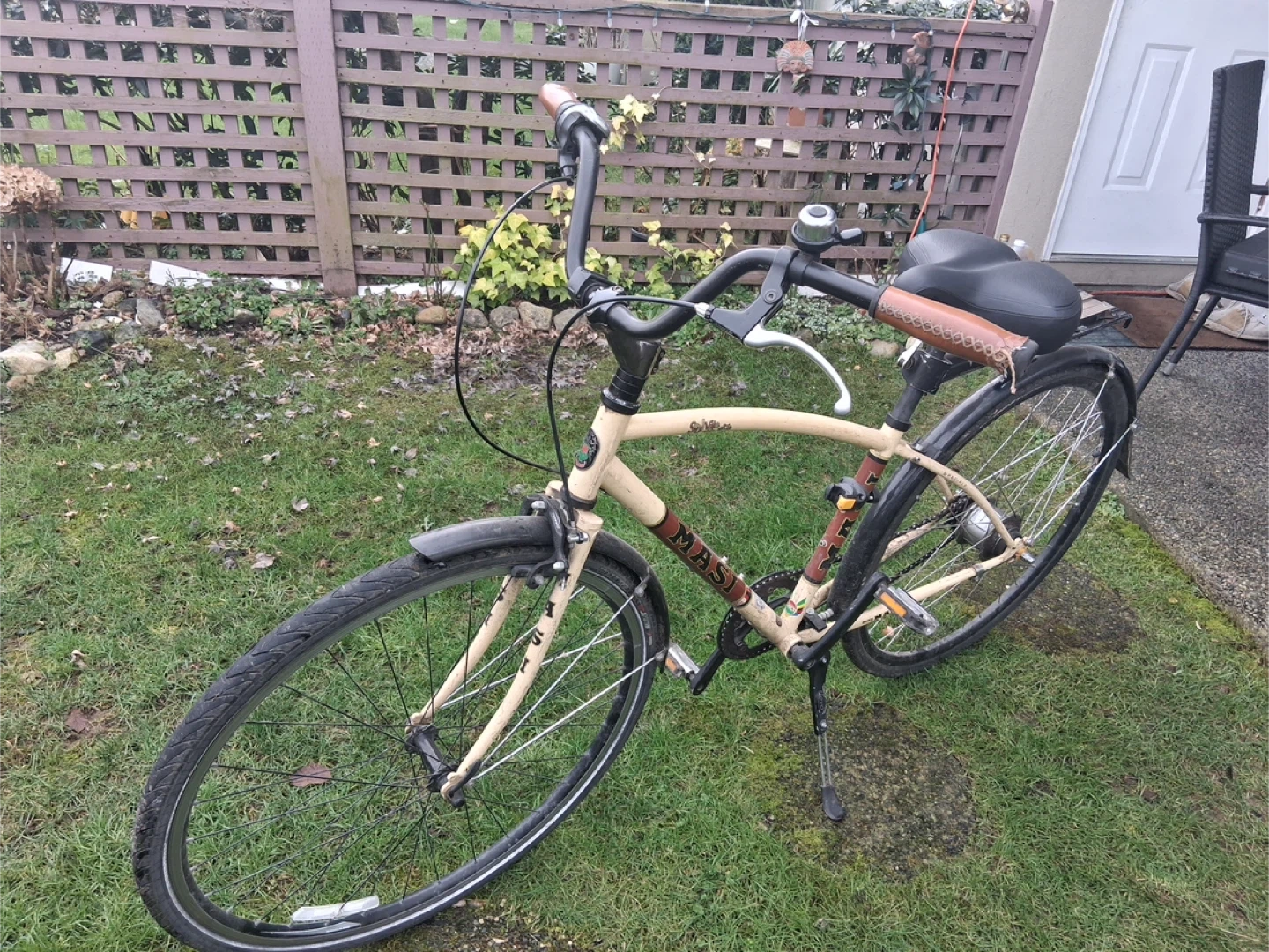 Light beige cruiser bicycle with brown accents and a black saddle. It's equipped with Shimano Nexus 8-speed shifters and fenders for a comfortable ride. This bike is great for leisurely rides around town.