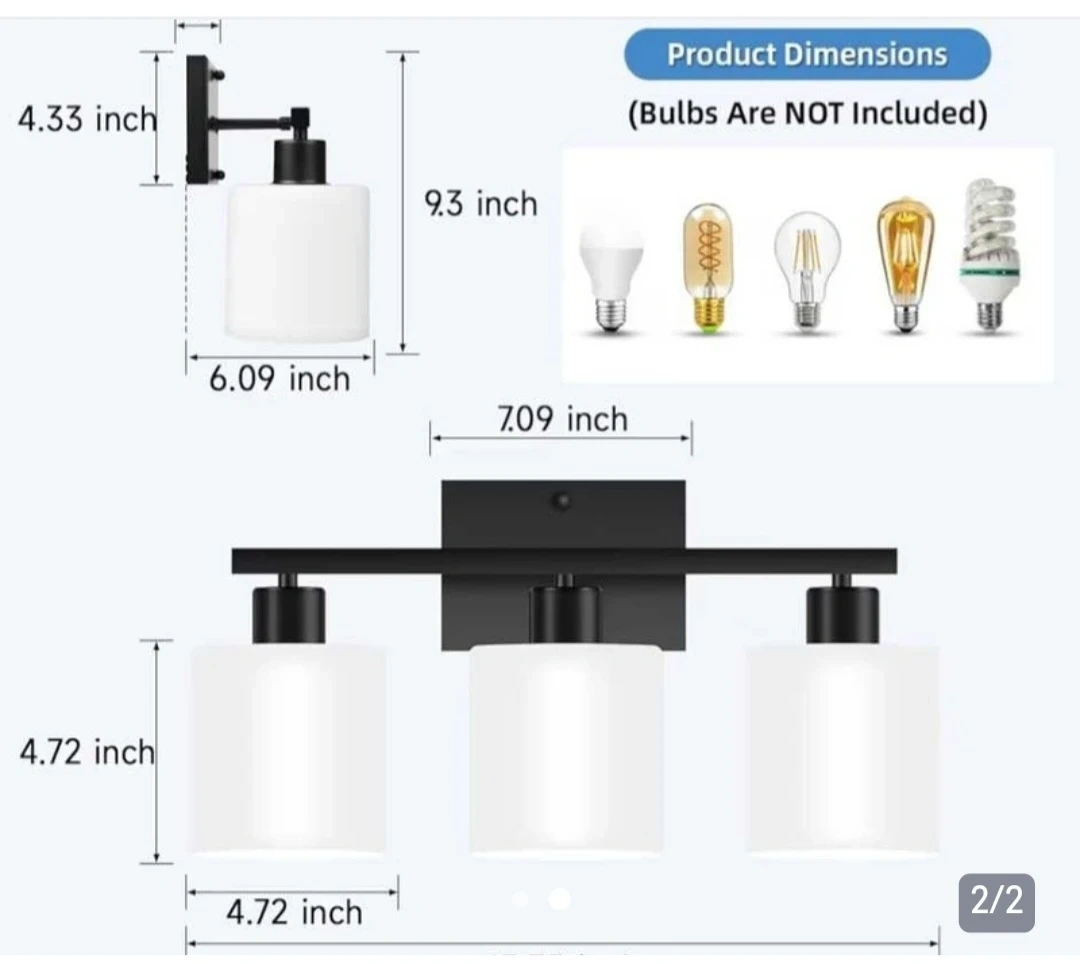 This is a 3-light vanity light fixture in black with white glass shades. The fixture has a total width of 17.5 inches and each shade is 4.72 inches in diameter. It's designed for bathroom or vanity use.
