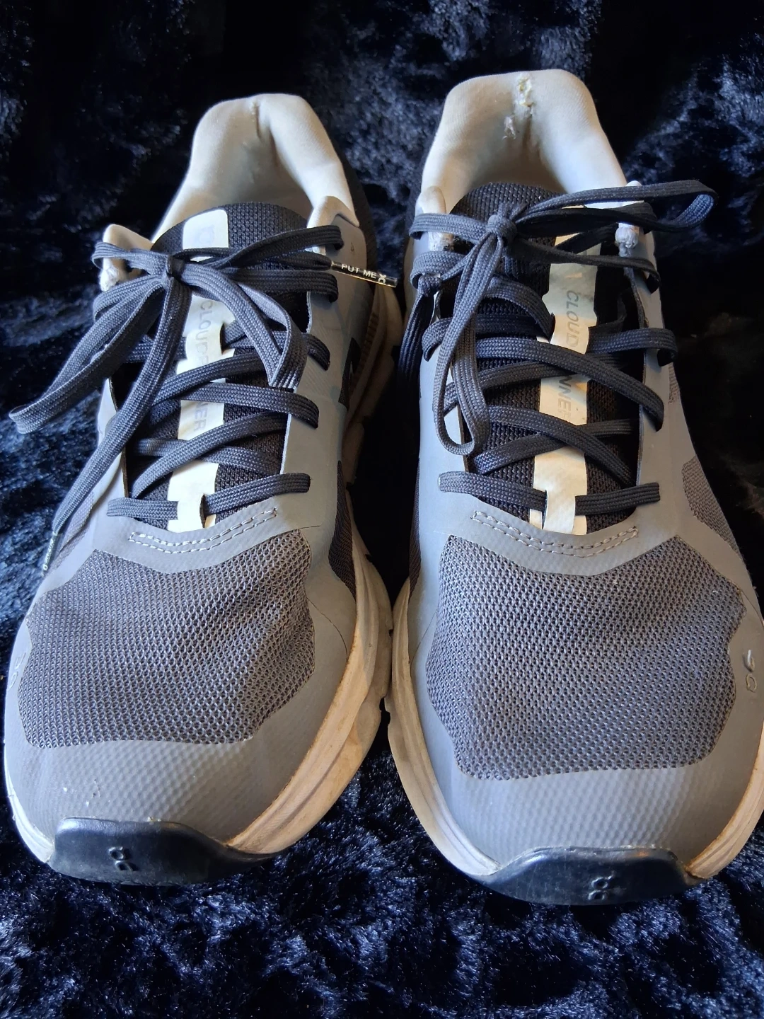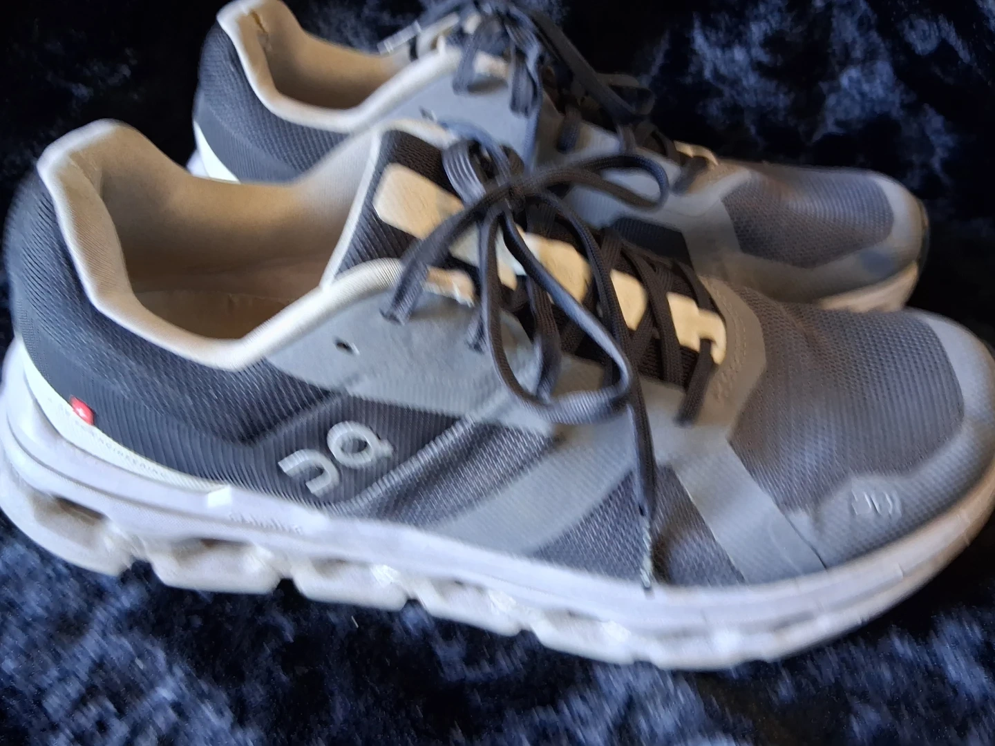 These are On Cloudflow running shoes. They're gray and black with white soles. Mesh upper for breathability. Designed for road running.