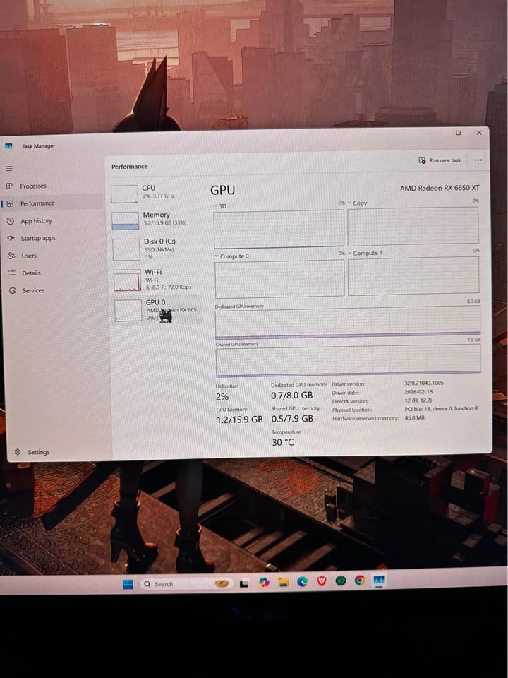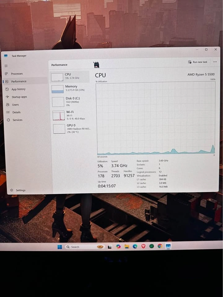 Everything is in pristine condition and works perfectly. Quick specifications: CPU: Ryzen 5 5500 (6 cores, 12 threads), GPU: RX 6650 XT (comparable to NVIDIA 3060), RAM: 16 GB DDR4 Corsair at 4133 MHz, Storage: 1 TB NVMe M.2, Motherboard: MSI Pro B550M with built-in Wi-Fi 6e, Power Supply: Corsair 650W. Windows 11 requires an activation key. Feel free to ask if you have any questions.