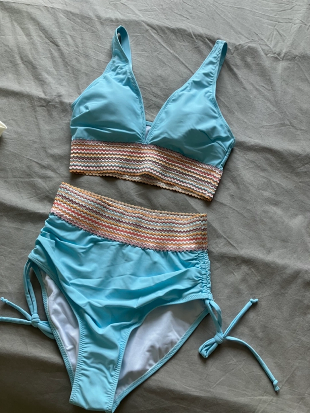 Cute new Women's two-piece swimsuit. High-waisted bottoms with drawstring. Sky blue colour. Features a colourful patterned band at the waist and bust. Size small. Tummy control.