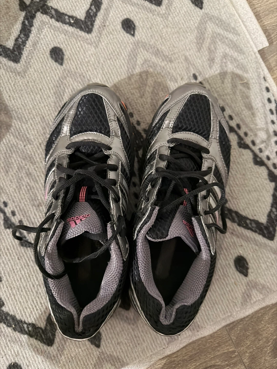 Selling a pair of Adidas running shoes, model V22746. They are a women's size 8.5 US. The shoes feature a black and silver colour scheme with pink accents. Great for running or everyday wear!