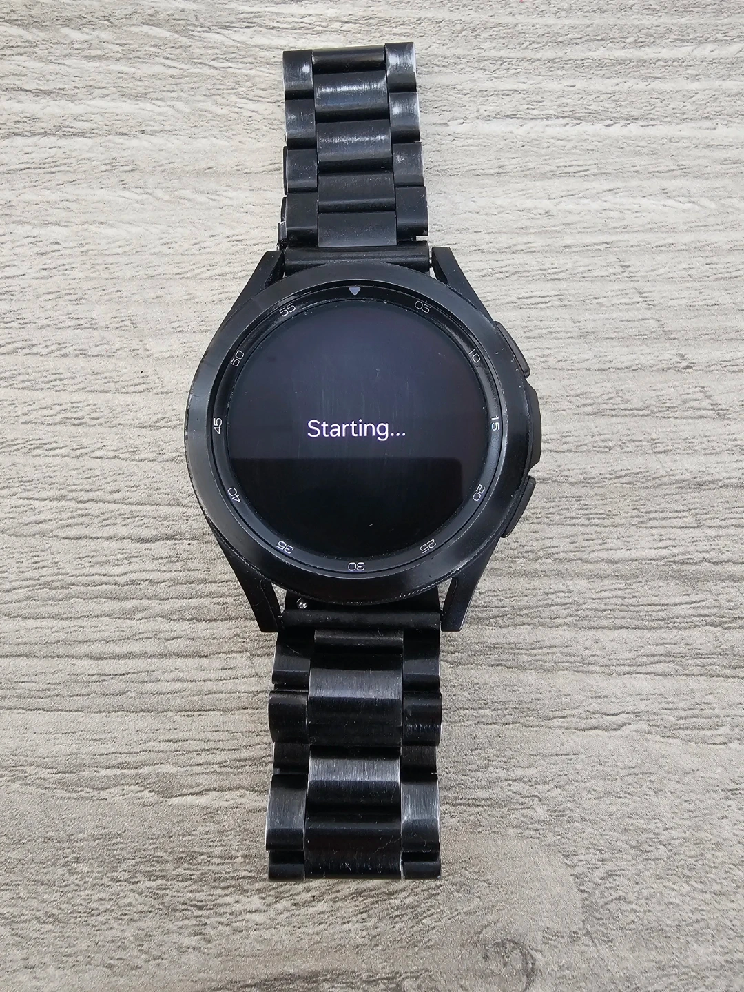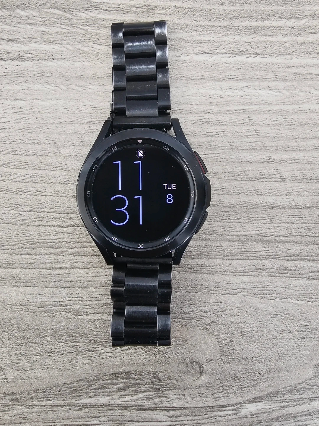 Black Samsung Galaxy smartwatch with metal band. Functions include time and date display. Secured by Knox.