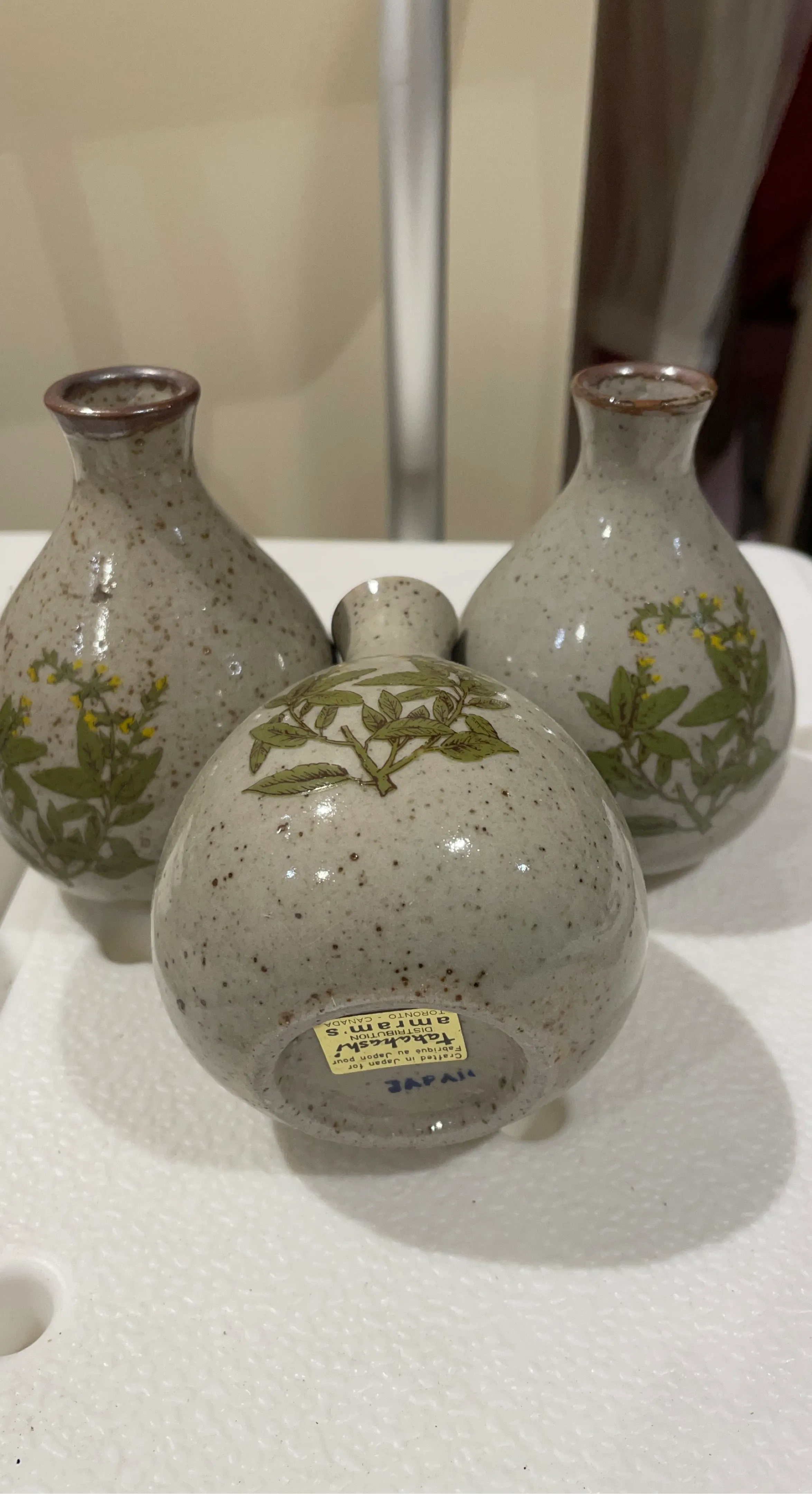 This is a set of three small ceramic vases crafted in Japan for Takahashi. They feature a speckled grey glaze with delicate green and yellow floral designs. Perfect for displaying small bouquets or as decorative accents.