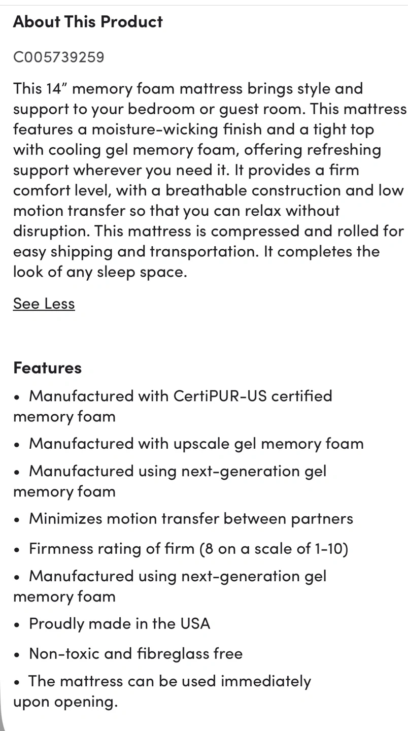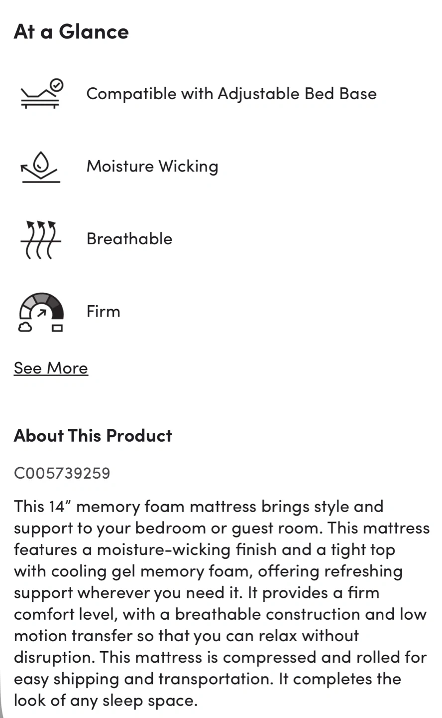 Unboxed but not used yet. This is a 14" memory foam mattress with a firm rating. It features a moisture-wicking and breathable fabric. The mattress is compatible with adjustable bed bases.