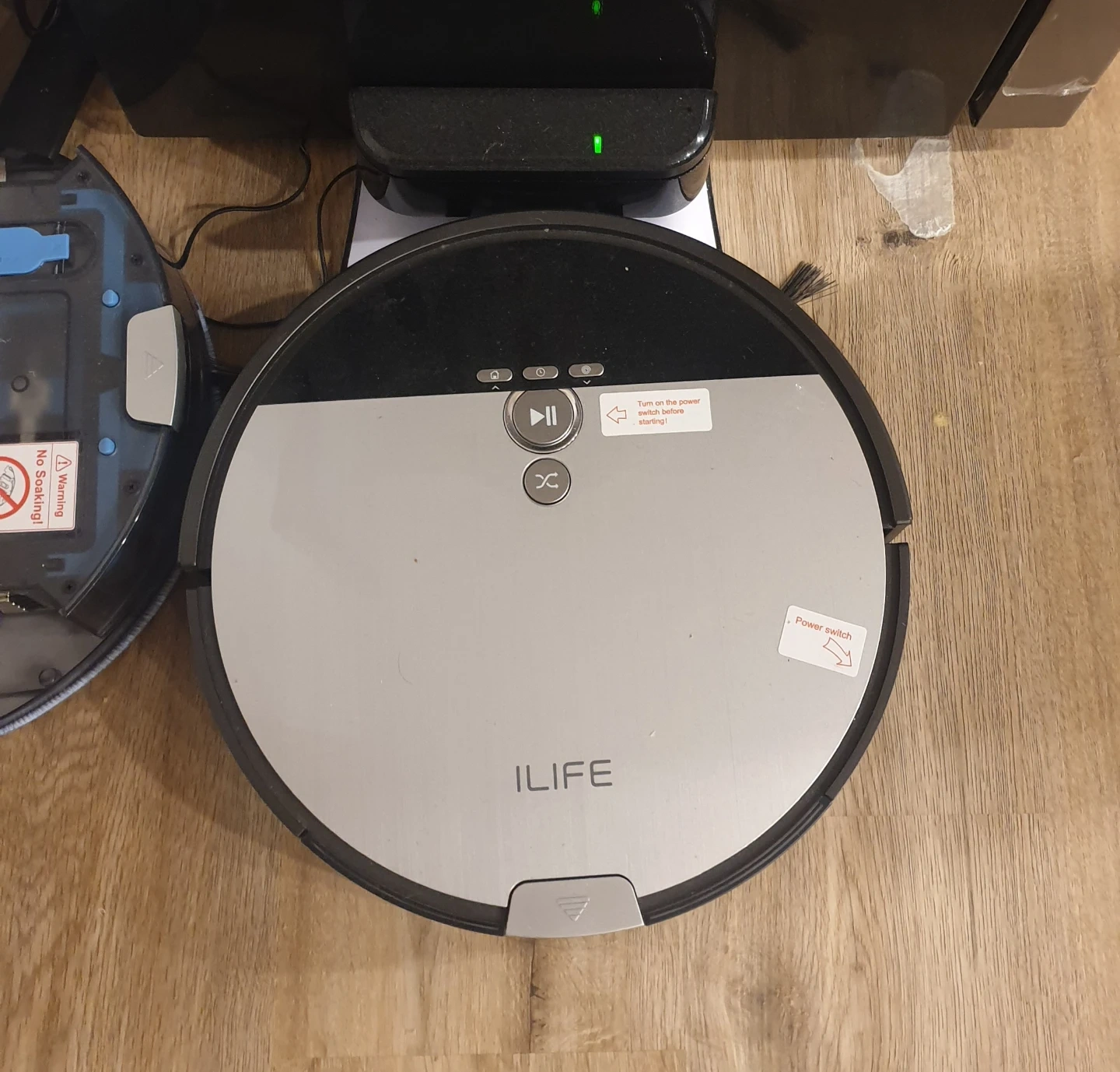 ILIFE robotic vacuum cleaner. This is a round, black and silver robot vacuum. It has buttons for play/pause and returning to its dock.
