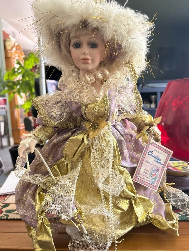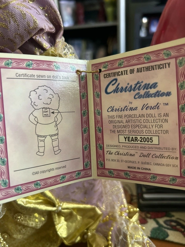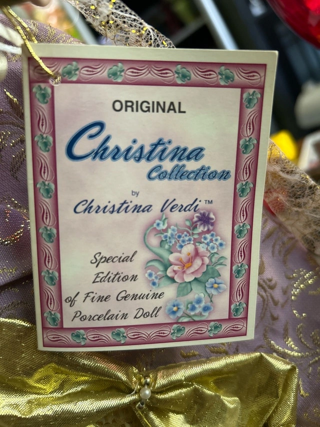 This is a special edition Christina Verdi porcelain doll from the Christina Collection, designed in 2005 for the serious collector! This beautiful doll is in good condition. It comes with a certificate of authenticity sewn on the doll’s back. Dressed in a gold and lavender gown with exquisite lace details and a feathered hat, this doll is a true work of art. Artist: Christina Verdi. Year: 2005. Special Edition. Similar dolls typically sell for $60-$120. Priced in the middle, but open to offers. If the ad is up, it’s available.
