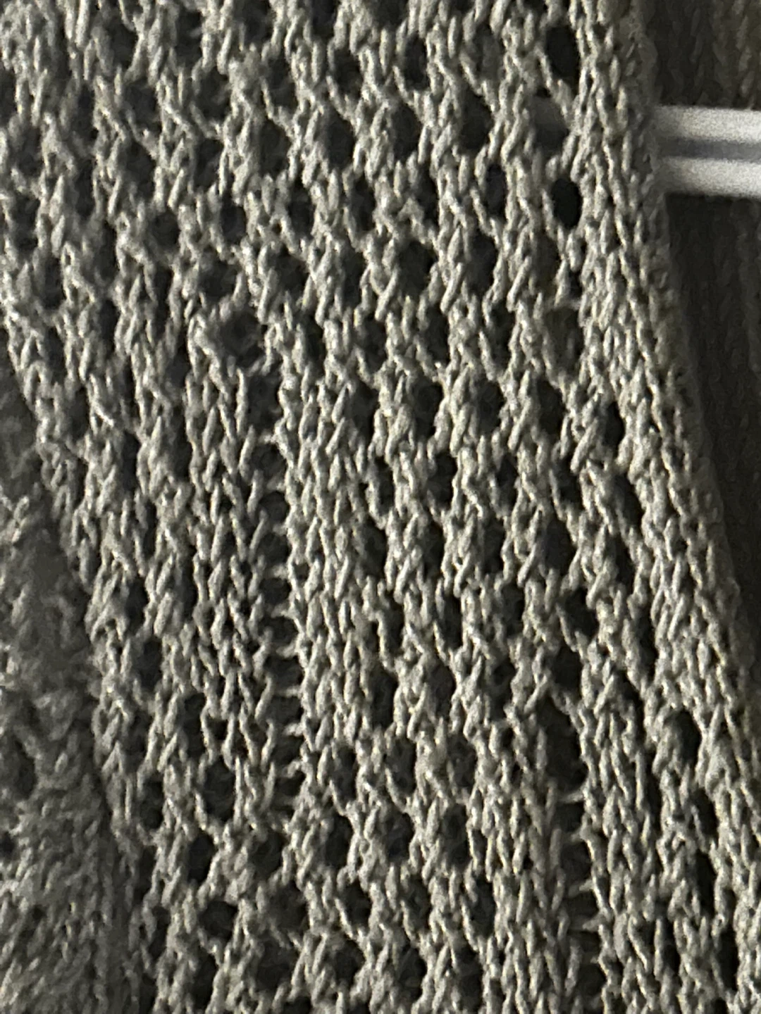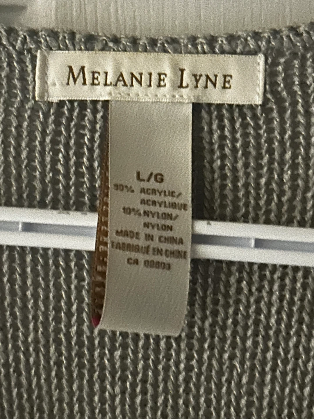 This is a Melanie Lyne women's knit cardigan sweater. It's a size L/G and made with 90% acrylic and 10% nylon. Features a decorative ring closure at the neckline.