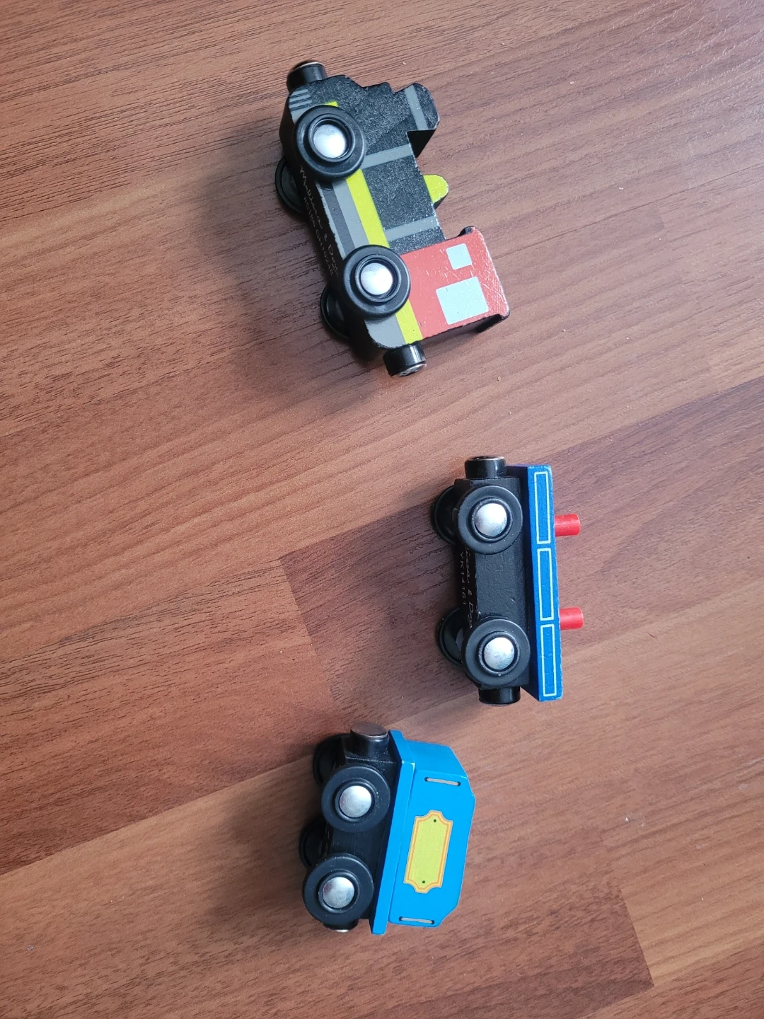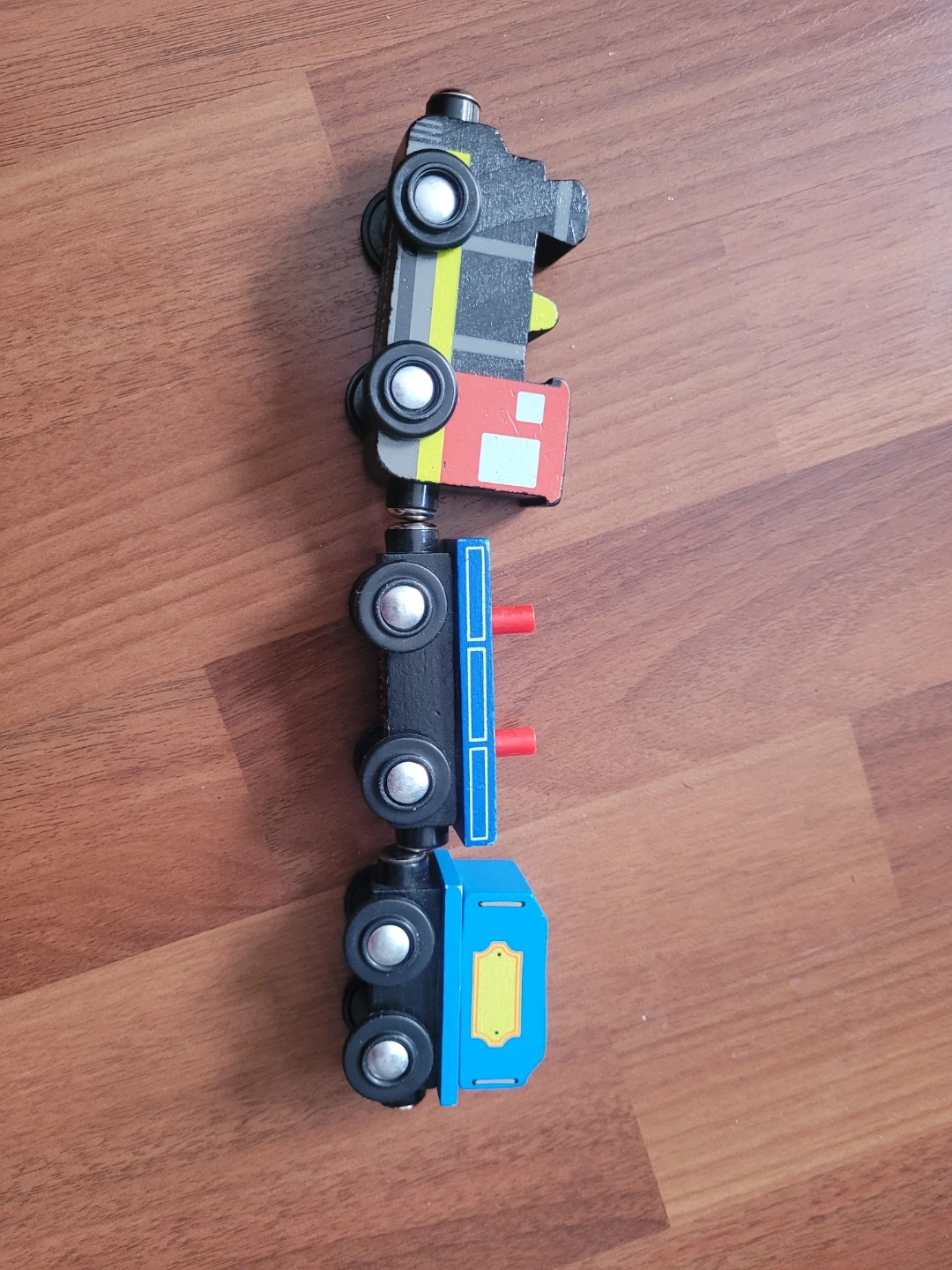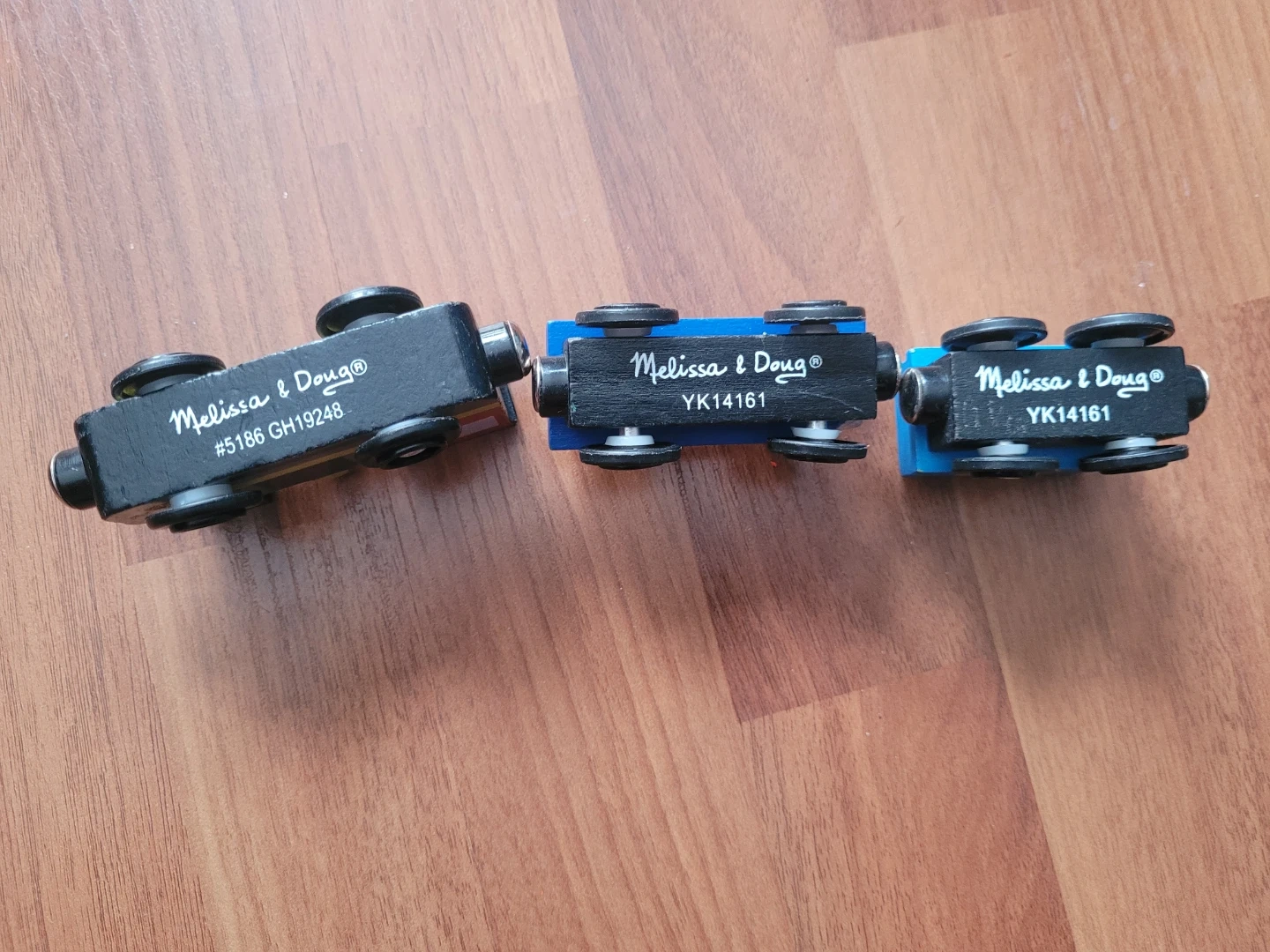 I am selling a used Melissa & Doug wooden toy train set, perfect for toddlers and young children. The train cars easily connect with magnets. This set has been well-loved and shows signs of wear, which can be seen in the pictures. This adds to the charm of the toy, it's been played with and loved!