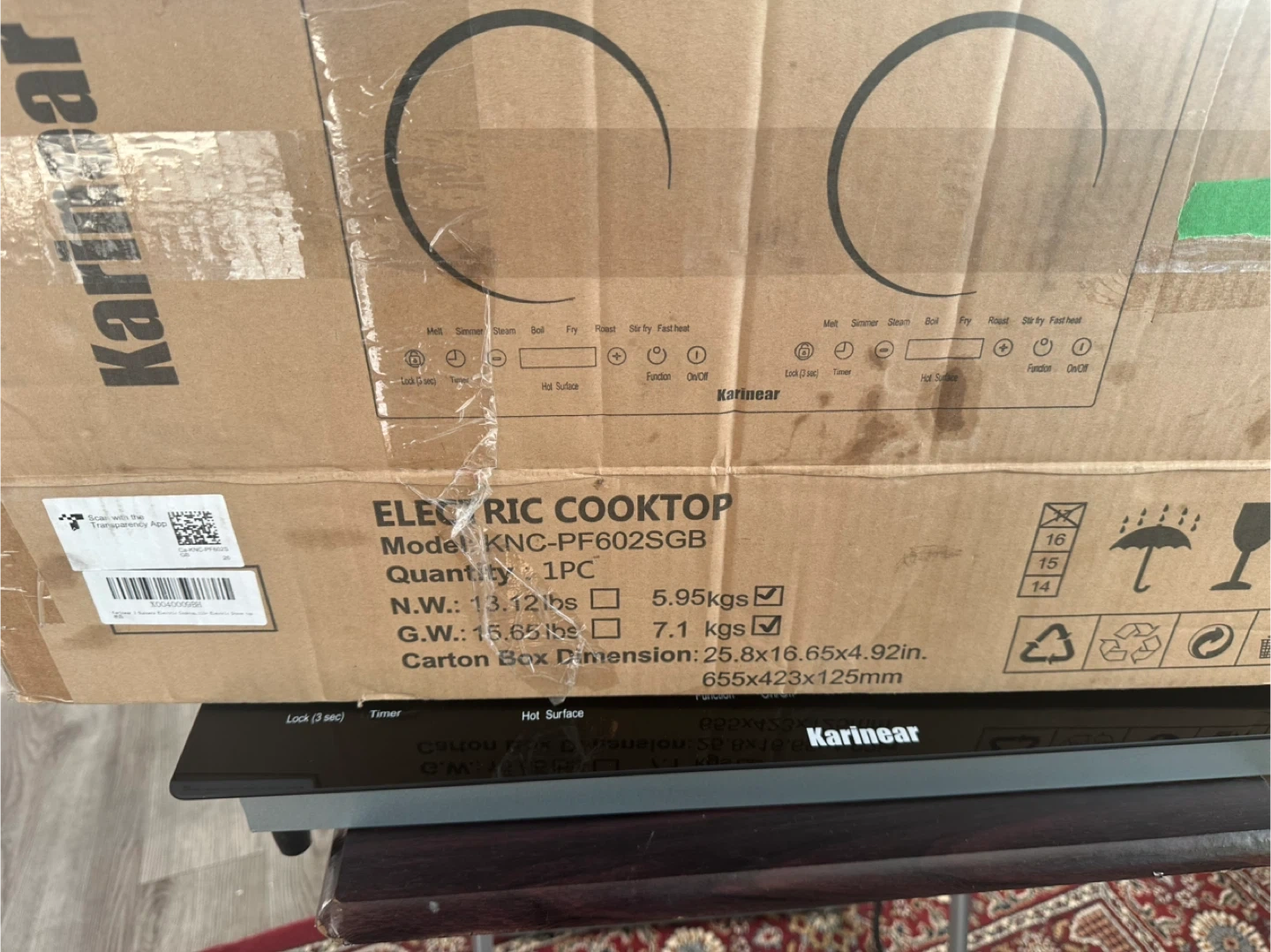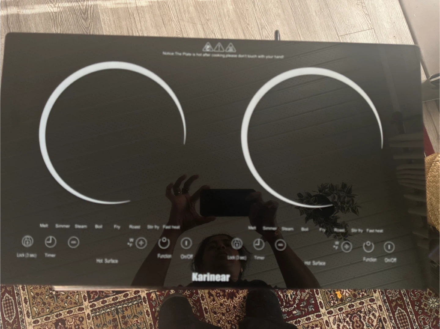 This Karinear electric cooktop features dual burners. It offers various cooking functions including Melt, Simmer, Steam, Boil, Fry, Roast, Stir-fry, and Fast Heat. The unit has a sleek black glass surface with touch controls. It's suitable for a variety of cooking needs in your kitchen.