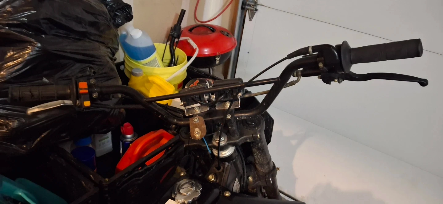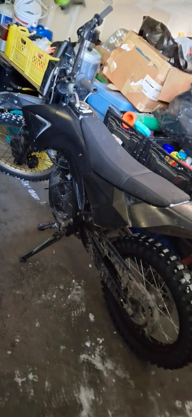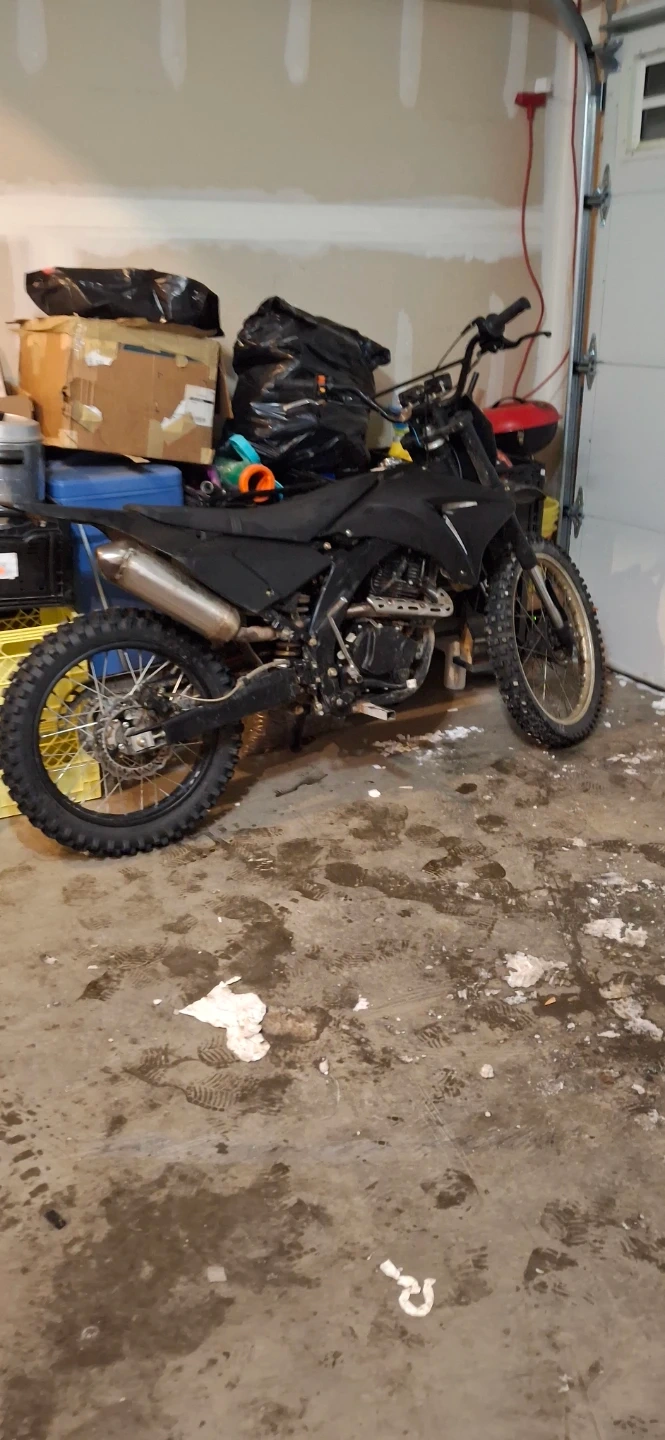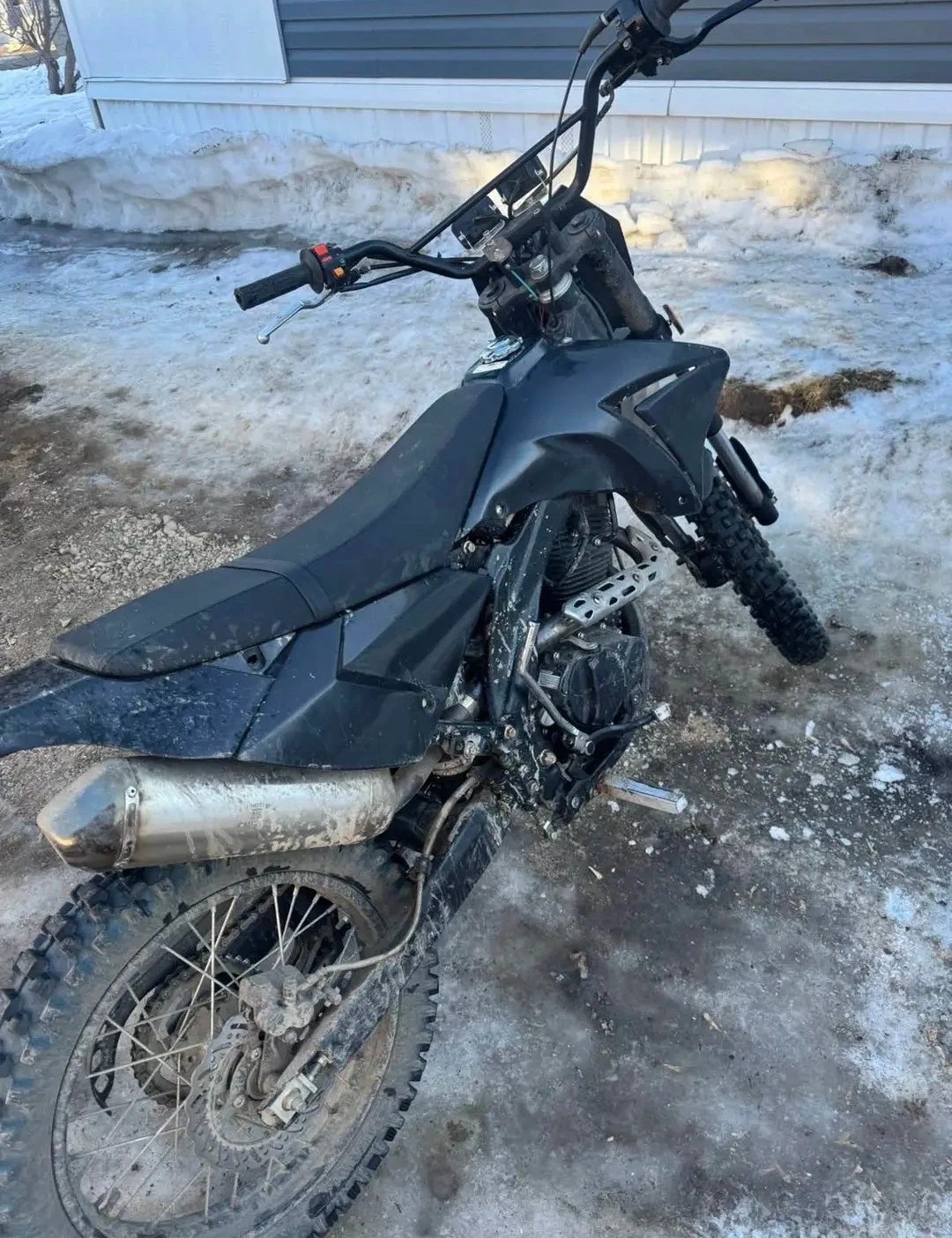 This is a black dirt bike. It's designed for off-road use. The tires have aggressive tread for traction. It's ready for your next adventure!