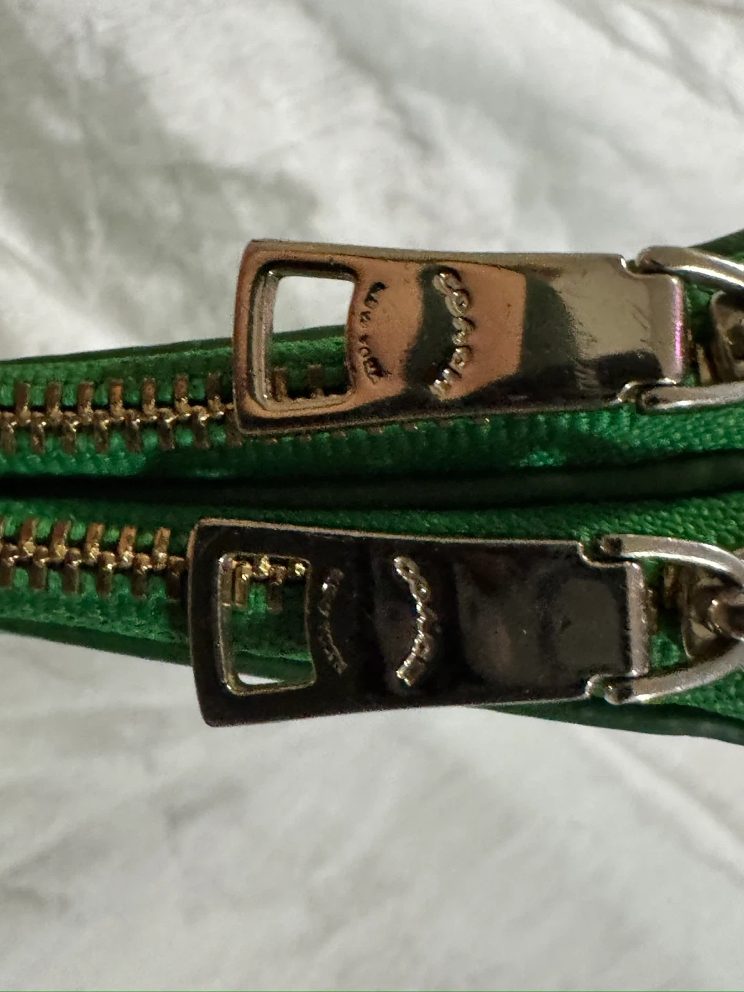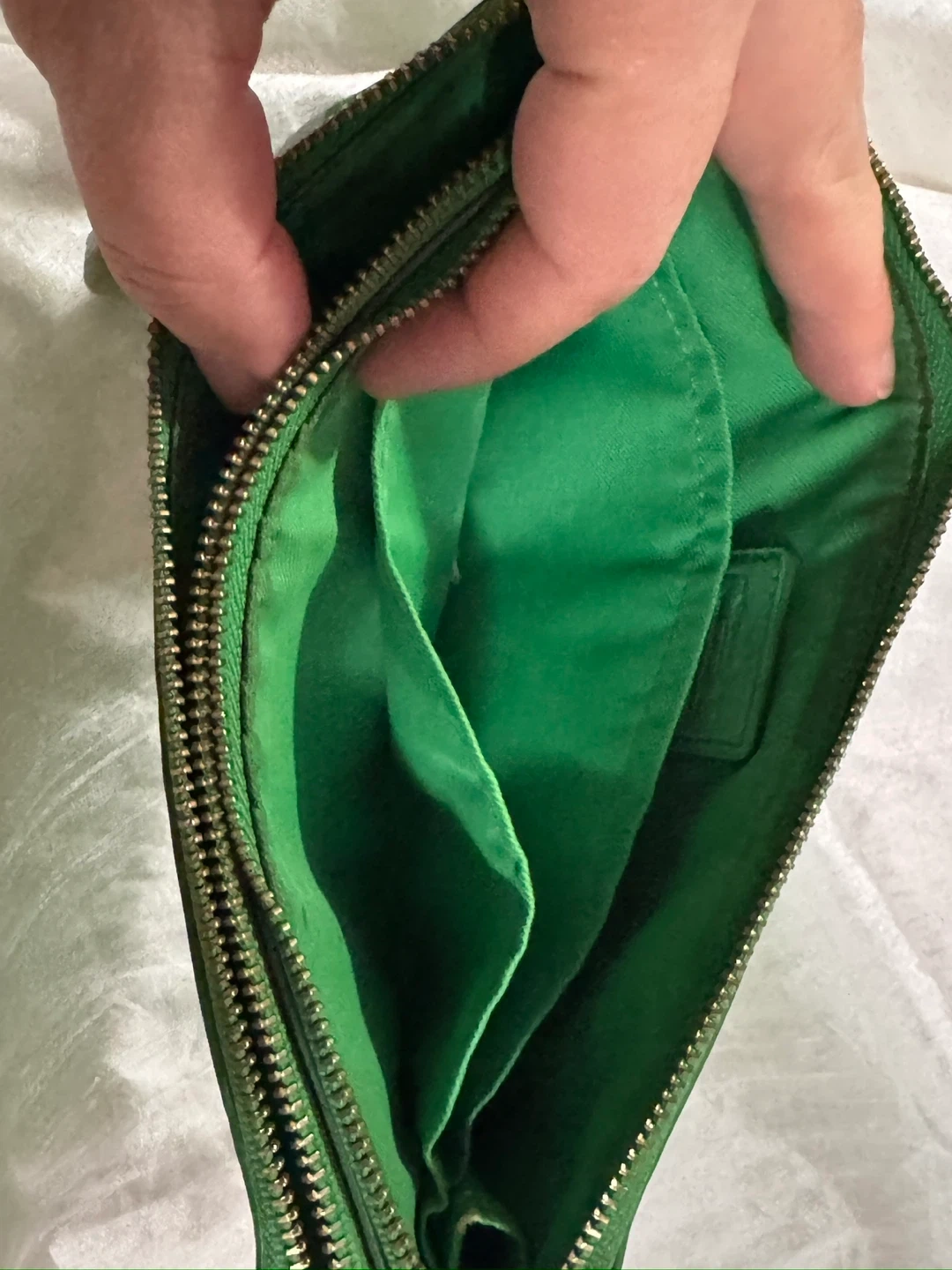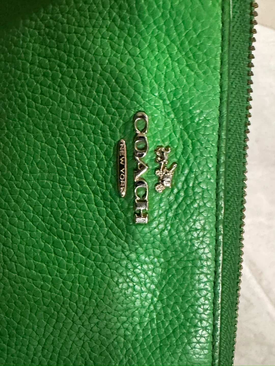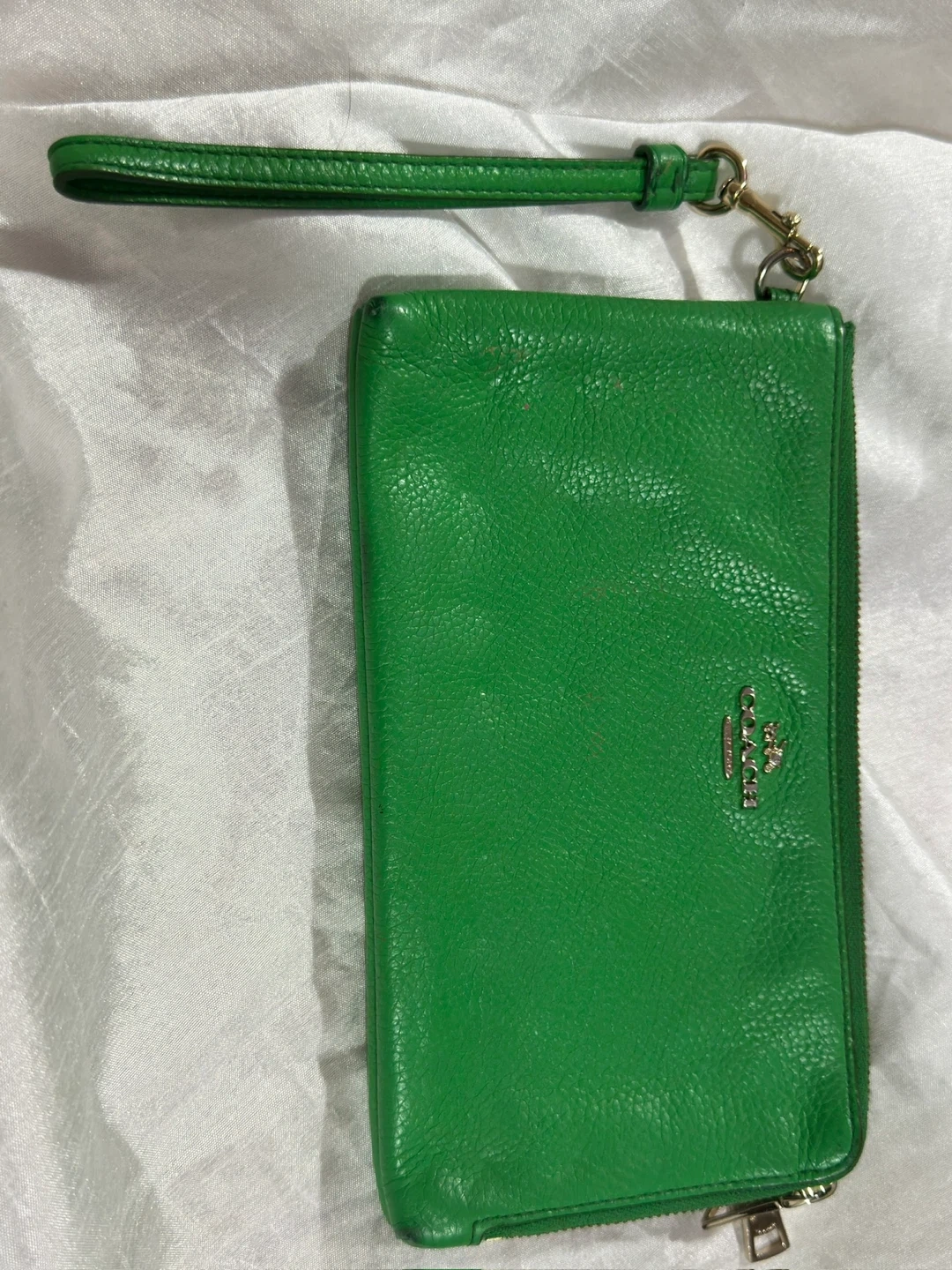 Selling a Coach wristlet wallet in a vibrant green leather! It's in good condition with some minor signs of wear. This stylish and practical accessory is perfect for keeping your essentials organized on the go. Feel free to ask any questions!