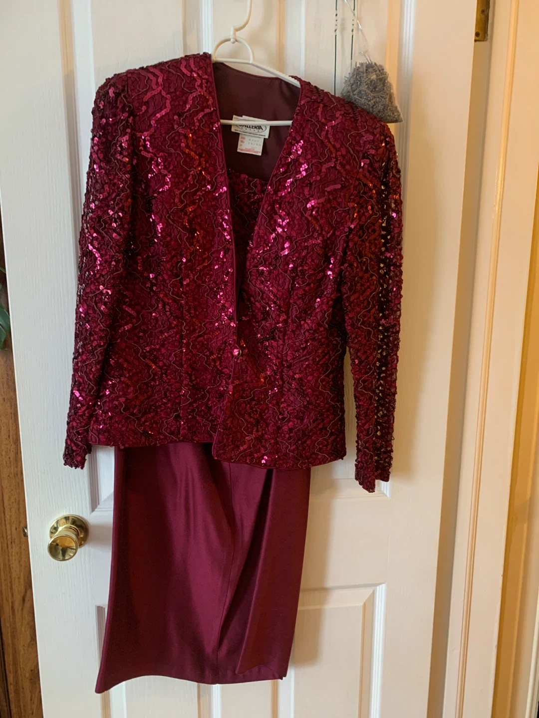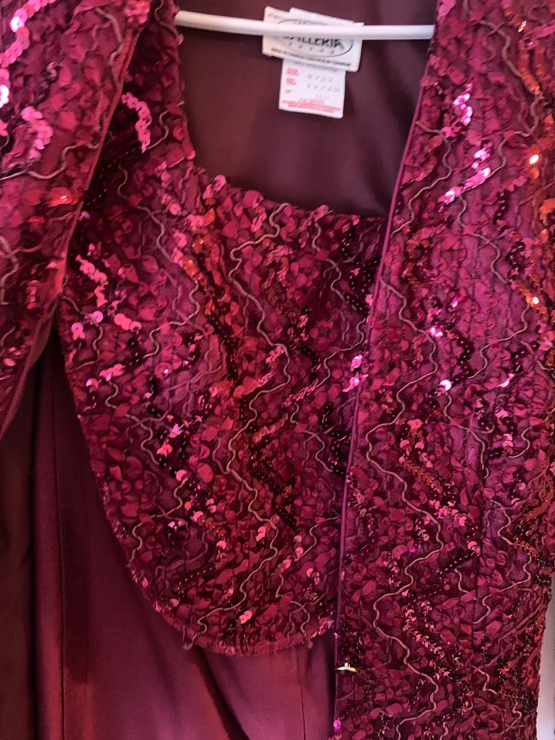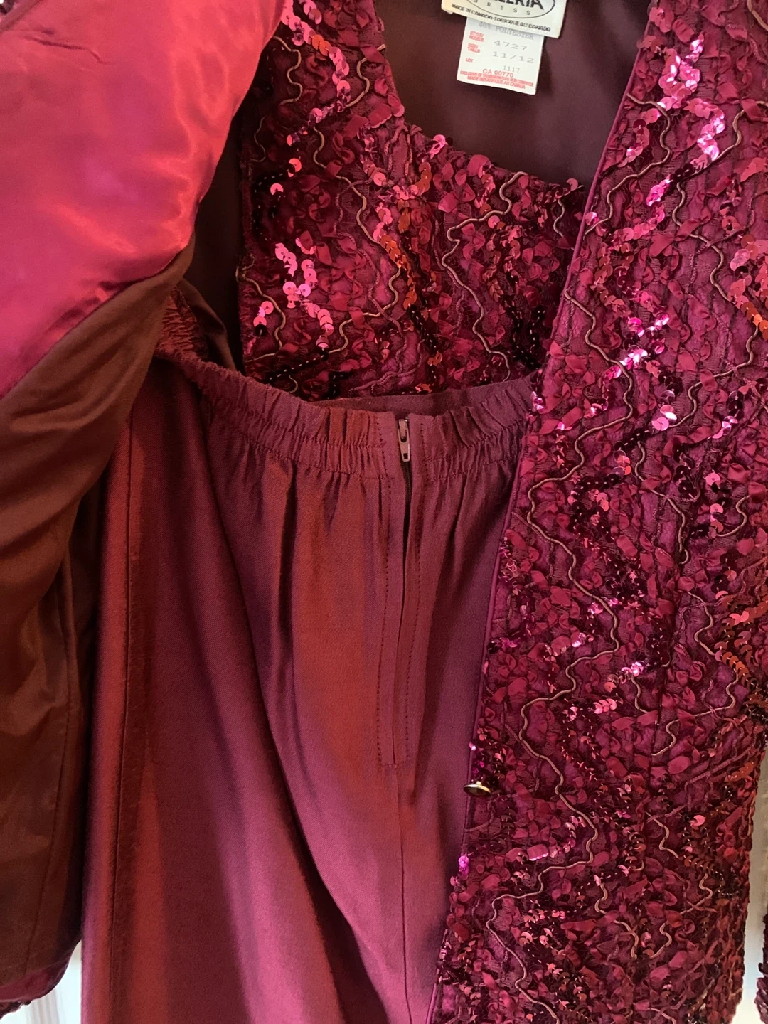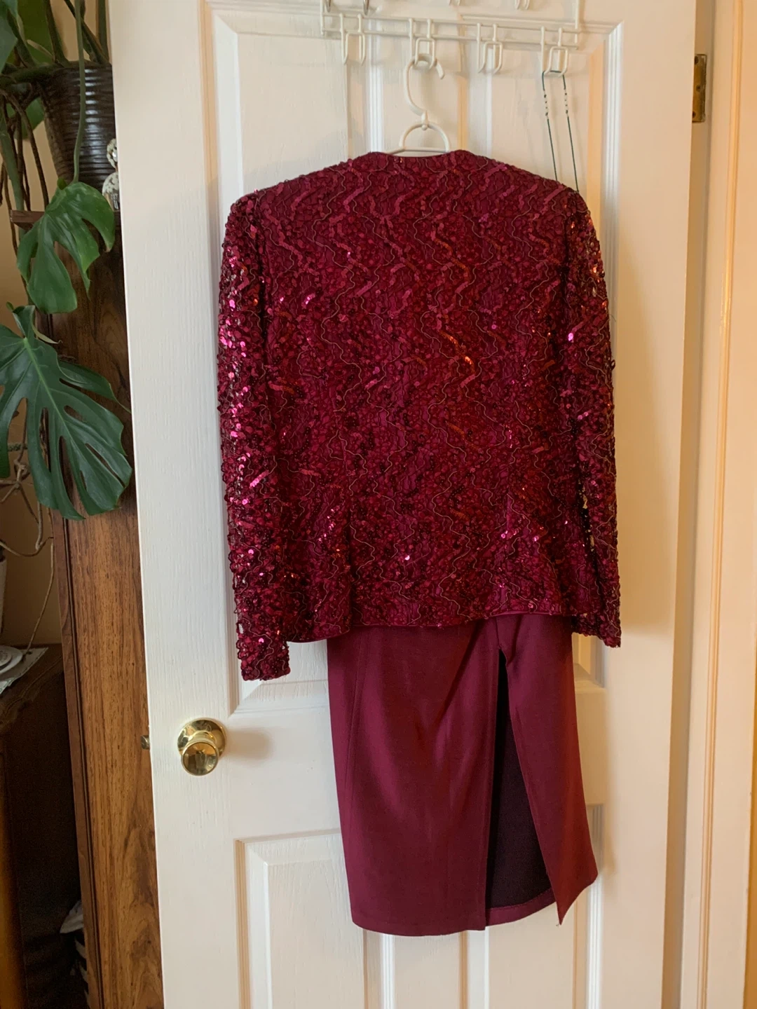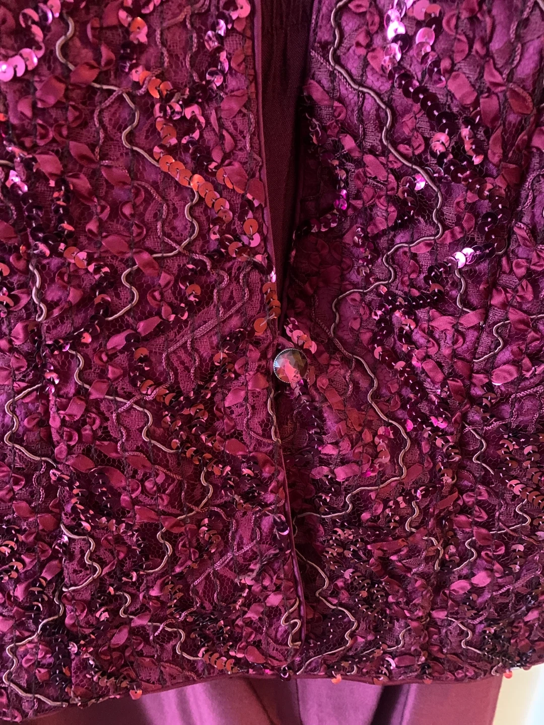 Gorgeous burgundy suit set featuring a sequin and lace overlay jacket and matching pants. Includes a sleeveless top. Perfect for a special occasion or formal event!