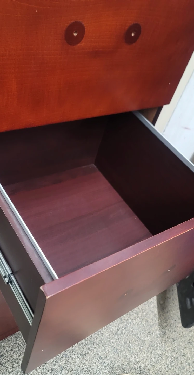 This is a cherry wood-finish four-drawer filing cabinet. It has metal drawer slides for smooth operation. The cabinet also features a lock with a key for security.