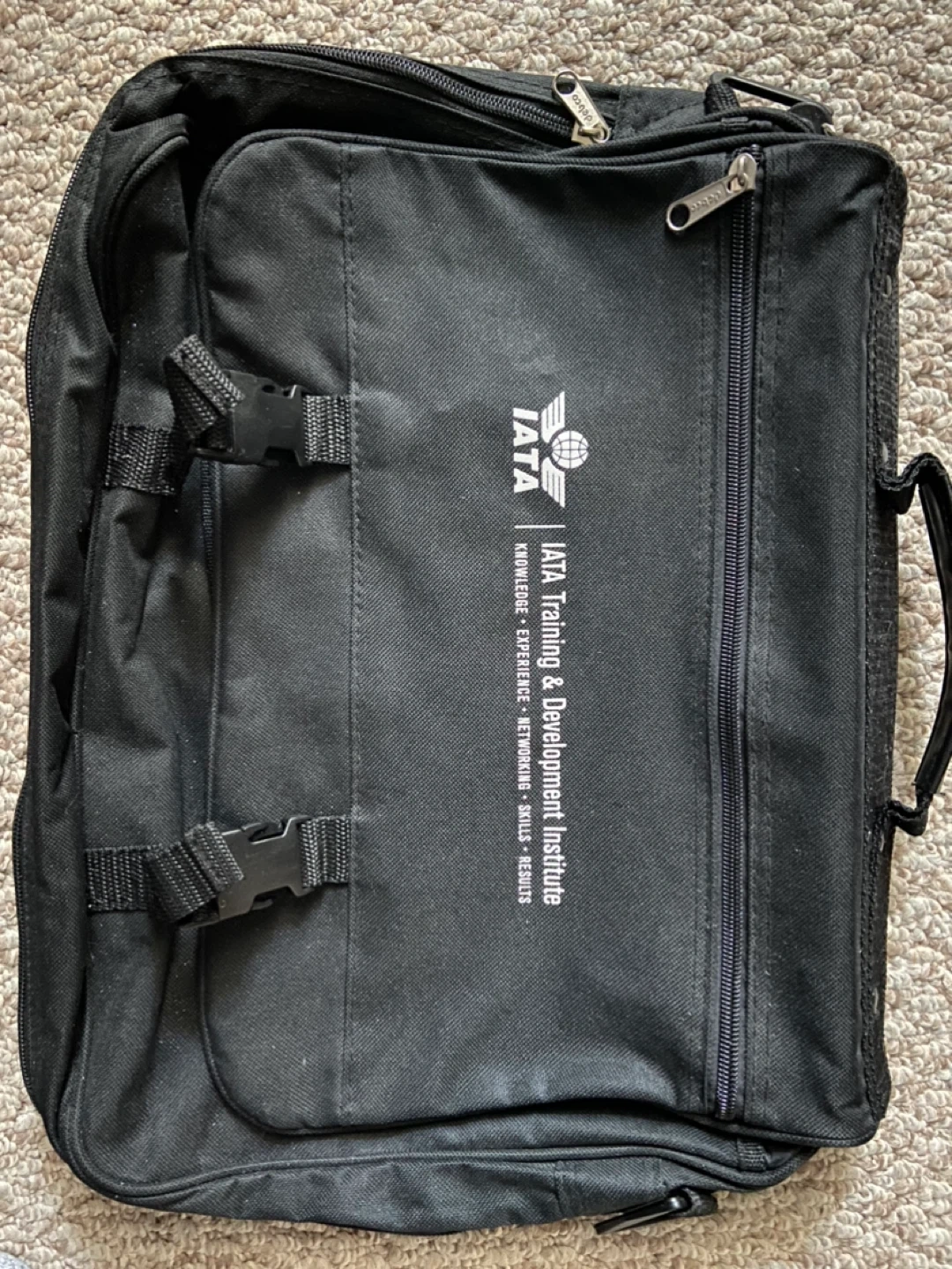 This black briefcase is from the IATA Training & Development Institute. It features multiple zippered compartments and external buckle straps. Durable fabric construction.