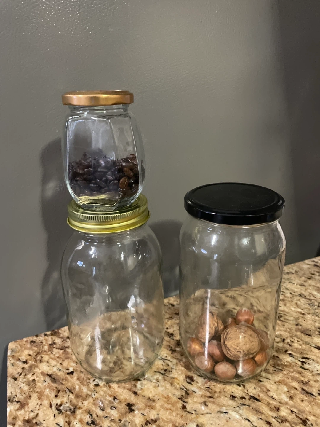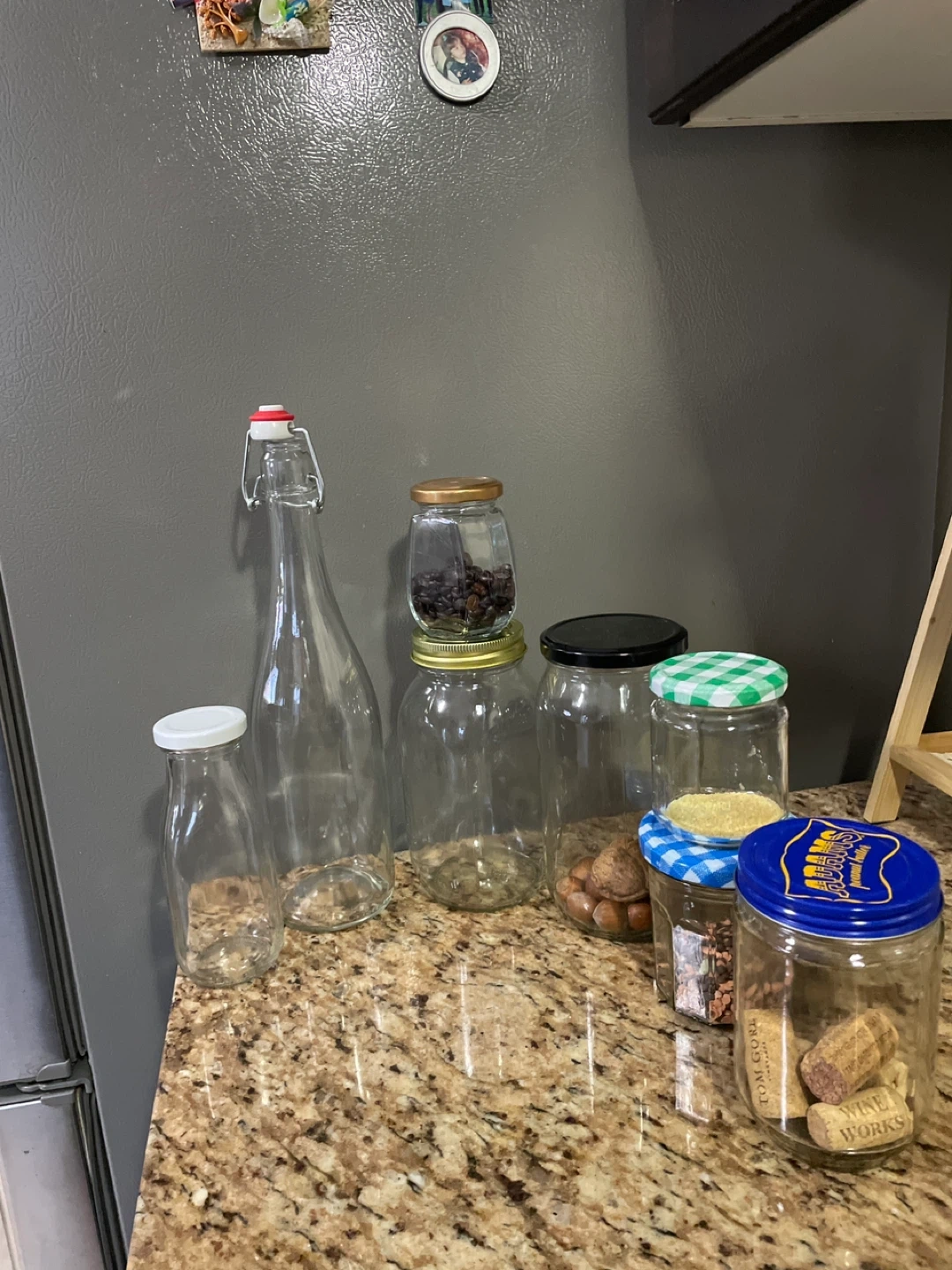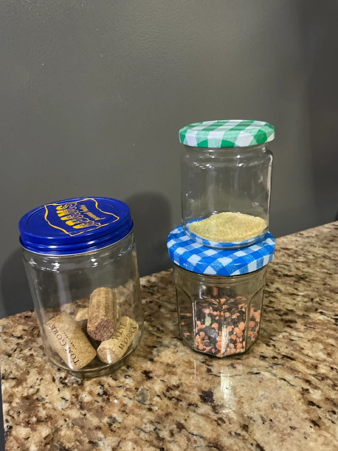 Assorted glass jars with decorative lids, perfect for storing pantry items or craft supplies. Comes with various lid types, including checkered patterns and metal screw tops. These jars are ideal for organizing your kitchen or workshop!
