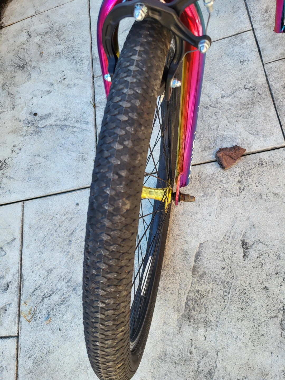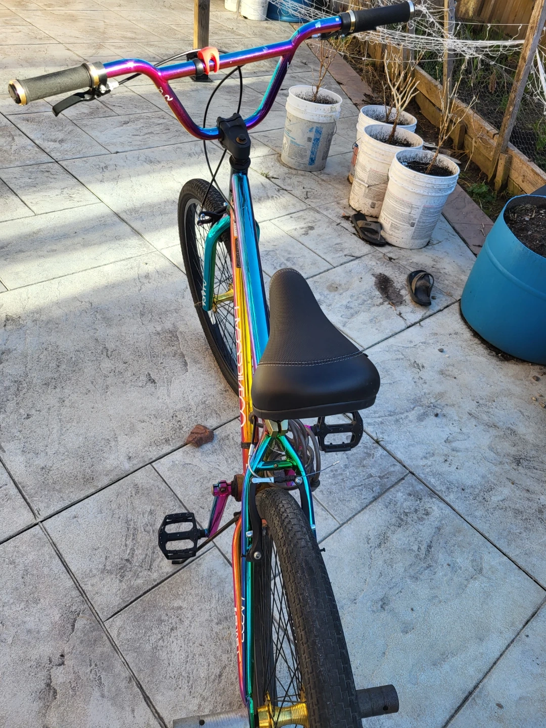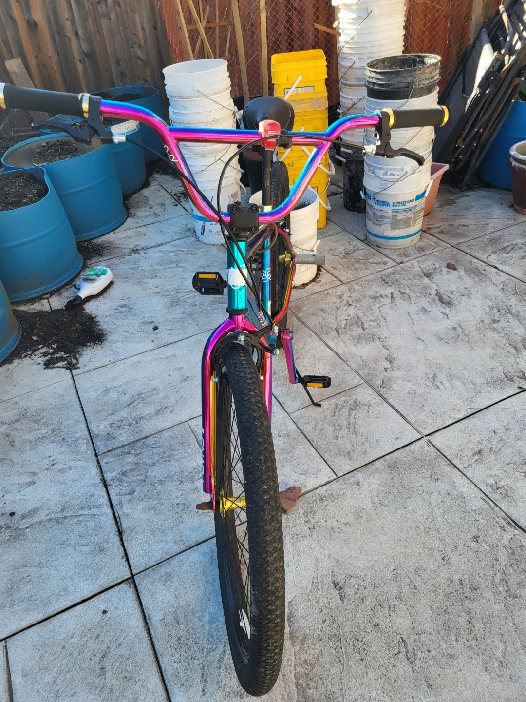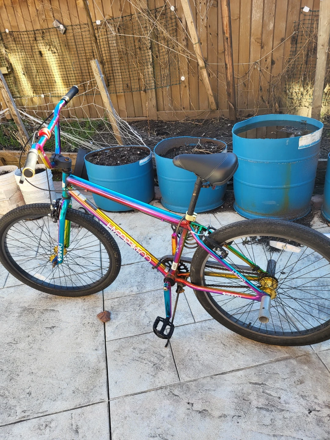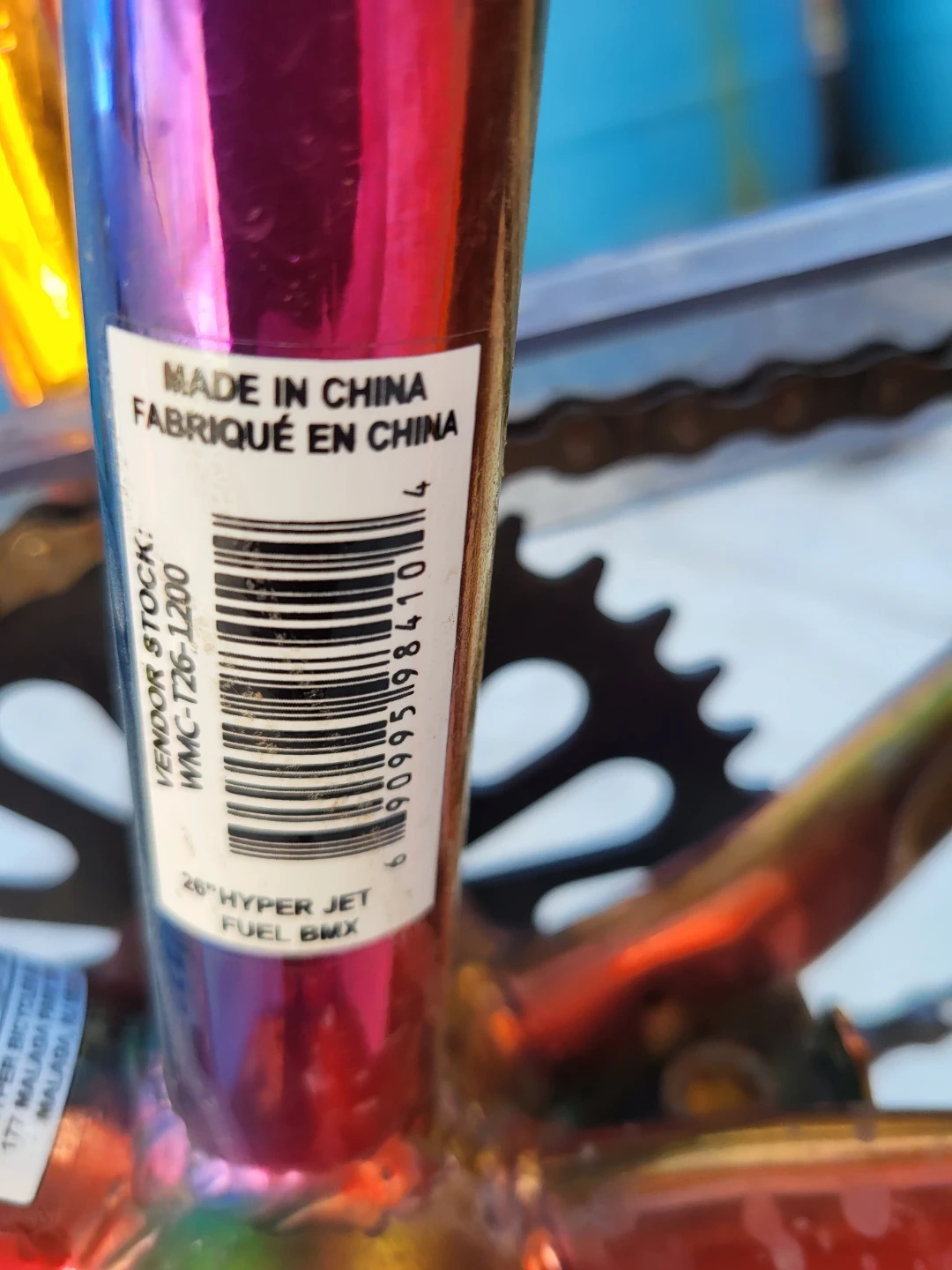 This is a 26" Hyper Jet Fuel BMX bike with a rainbow oil slick finish. It's got sturdy construction for cruising or tricks. It's a cool bike for getting around town! Original price was $350