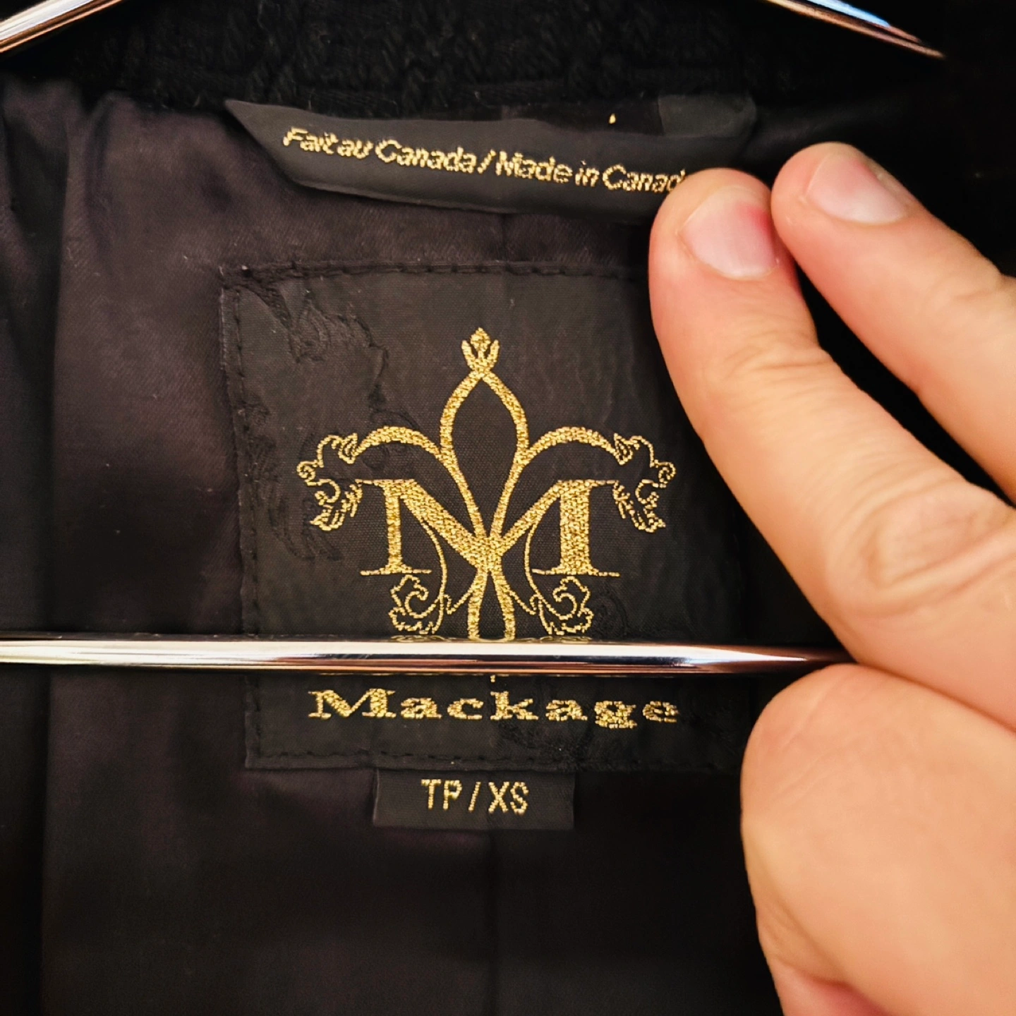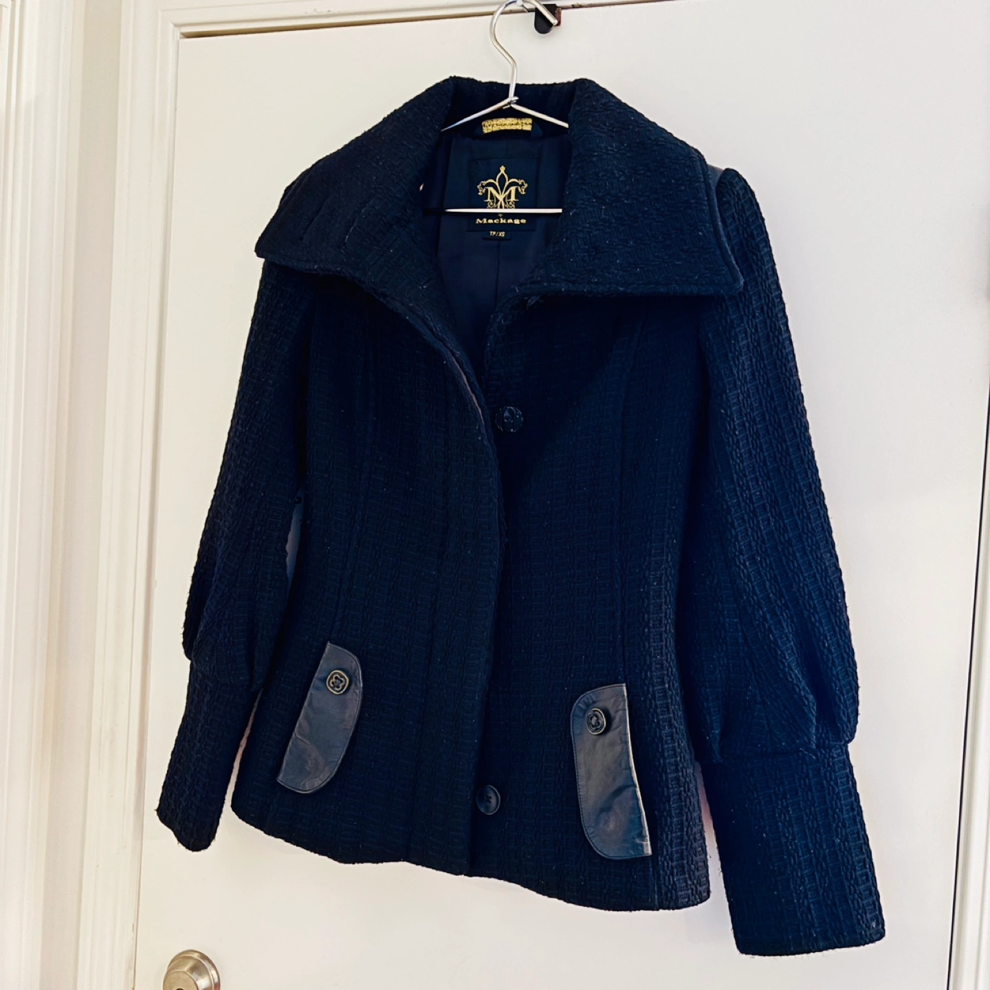 Beautiful Mackage black wool peacoat / jacket with satin interior and stylish leather shoulder and pocket details. Fits Size S, tag says XS. This is a made in Canada jacket - higher quality than their newer stuff which is getting cheaper, cutting corners, and made in China. Perfect for spring, fall, and mild winter days.