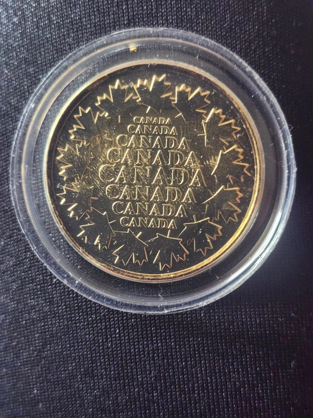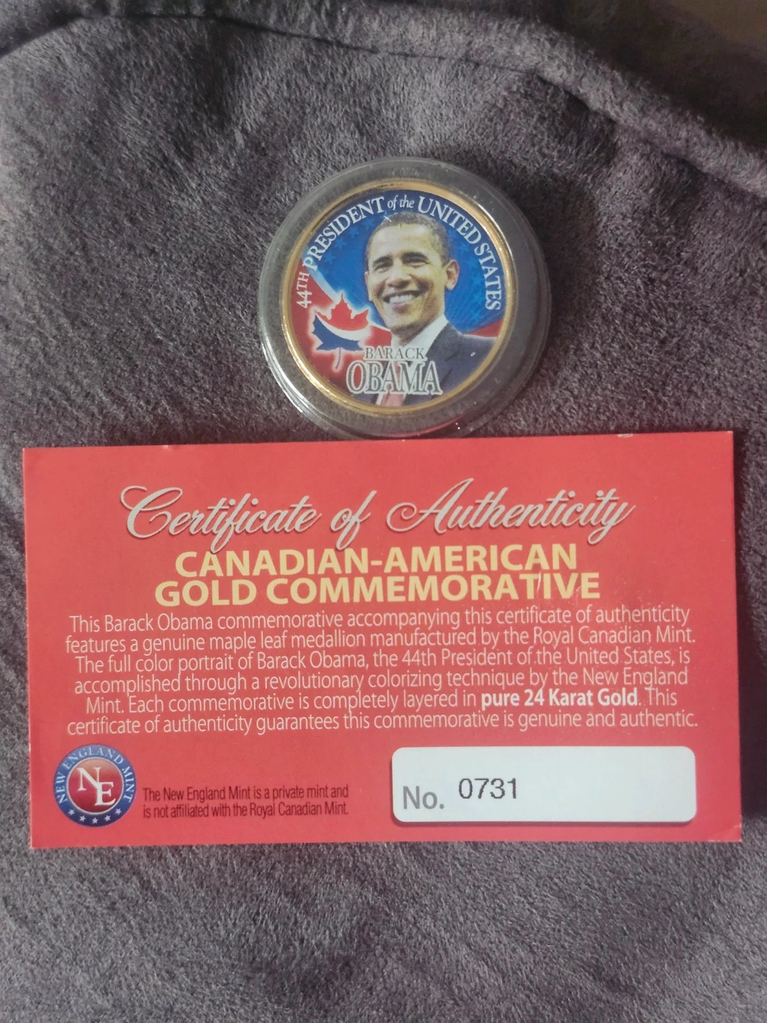 This is a Canadian-American Gold Commemorative featuring Barack Obama. It's a genuine maple leaf medallion manufactured by the Royal Canadian Mint. The full colour portrait is achieved with a special colourizing technique. It's layered in pure 24 Karat Gold.