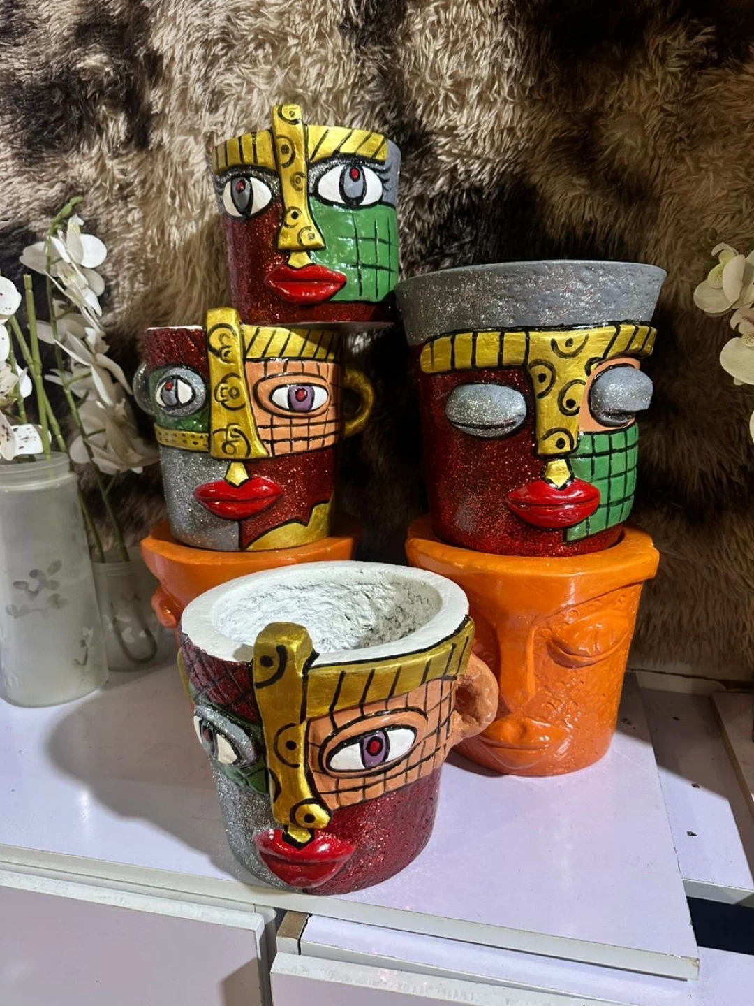 15Unique and eye-catching flower pots with a face design! These pots are perfect for adding a touch of artistic flair to your home or garden. Each pot features a different colour scheme and design, making them a standout piece. They are in great condition and ready to house your favourite plants. These pots are SHATTER PROOF.