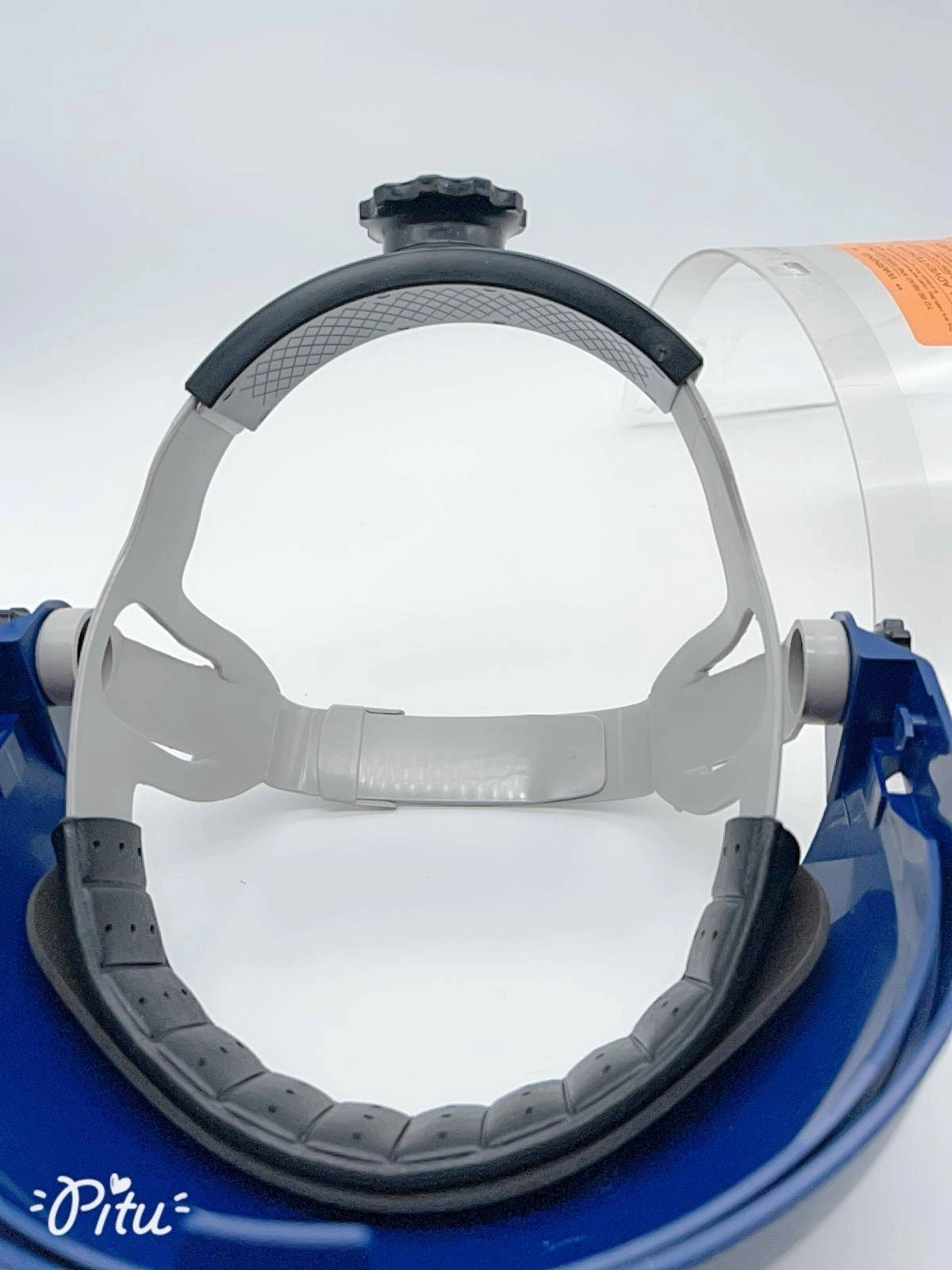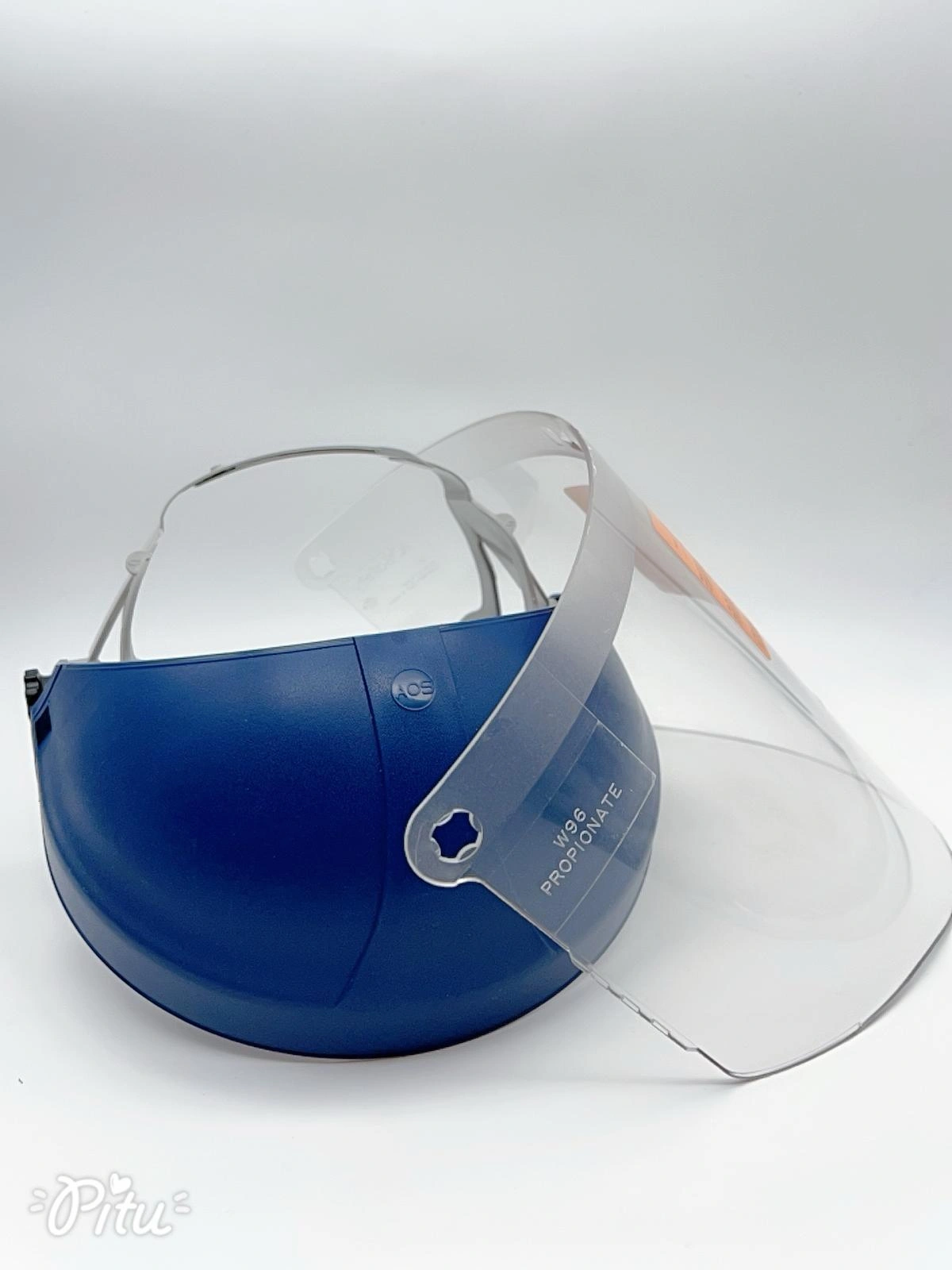 Blue face shield with a clear polycarbonate visor and an adjustable head strap, designed for protective use in medical or industrial settings.
