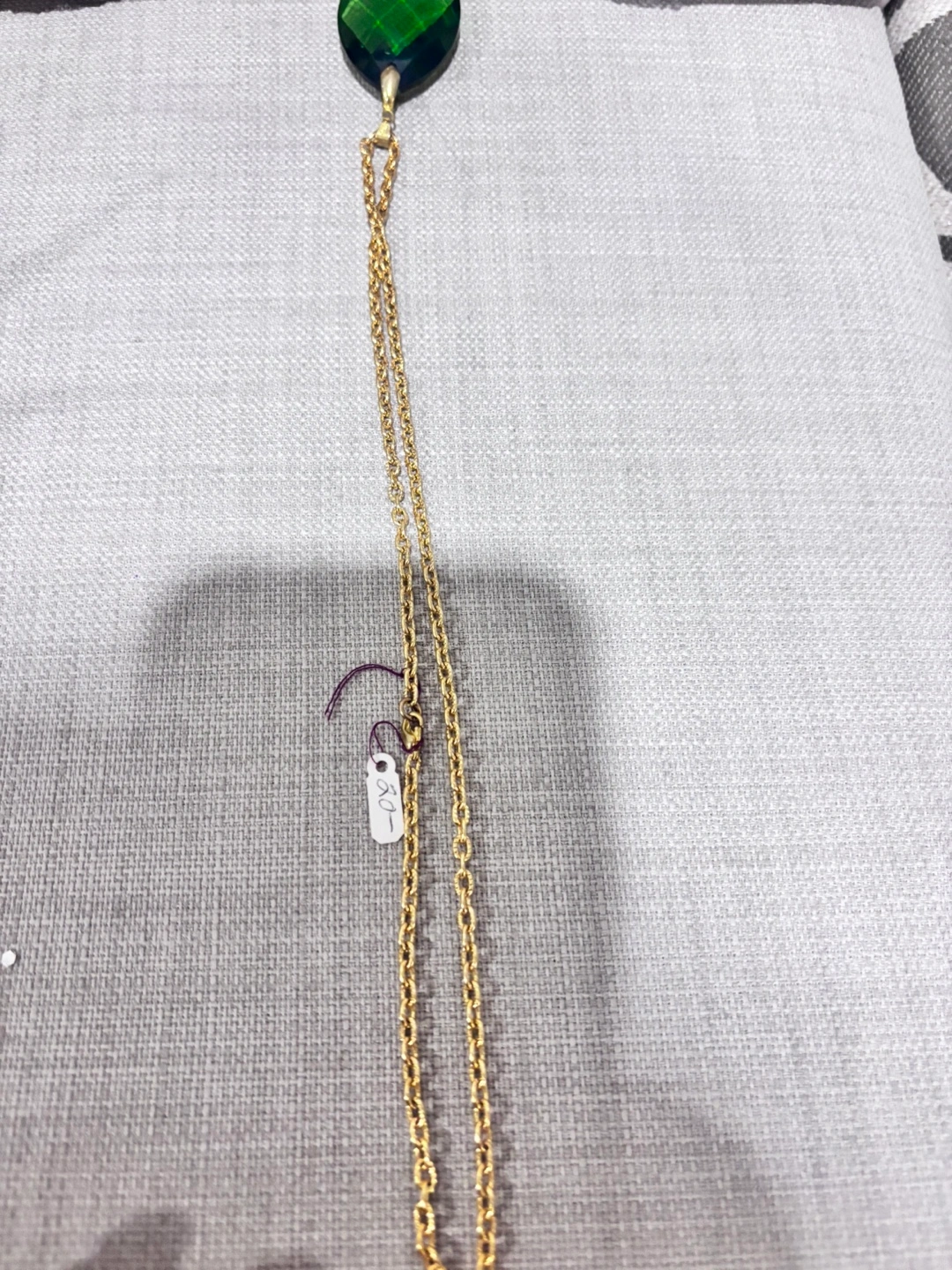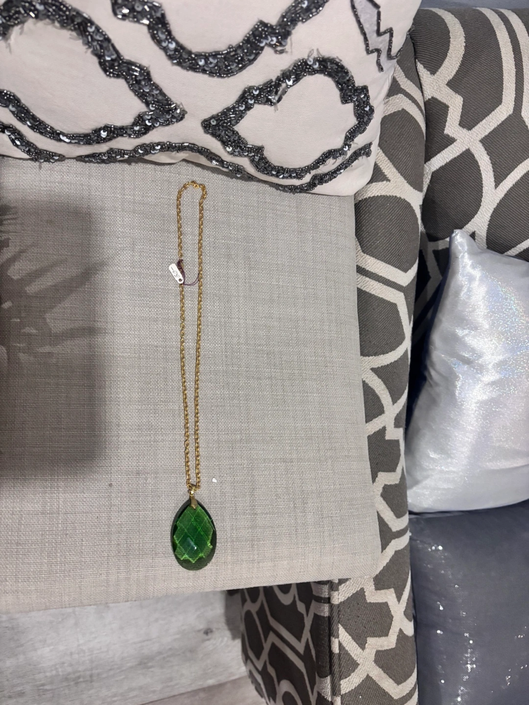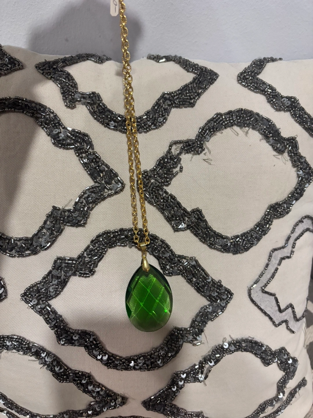 47Elegant Green Teardrop Pendant Necklace — features a faceted glass gemstone in rich emerald green on a gold-tone chain. The pendant catches light beautifully with its diamond-cut finish, making it the perfect statement piece for both casual and evening wear. Lightweight and stylish, this necklace adds a pop of color and sophistication to any outfit. Details: • Pendant size: approx. 2 in (5 cm) drop • Chain length: approx. 14-16 inches • Material: Faceted glass pendant, gold-tone alloy chain • Condition: Excellent, New