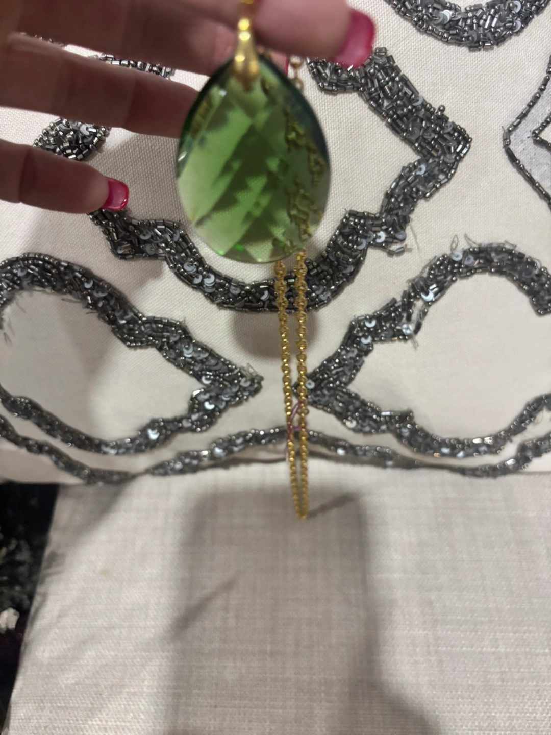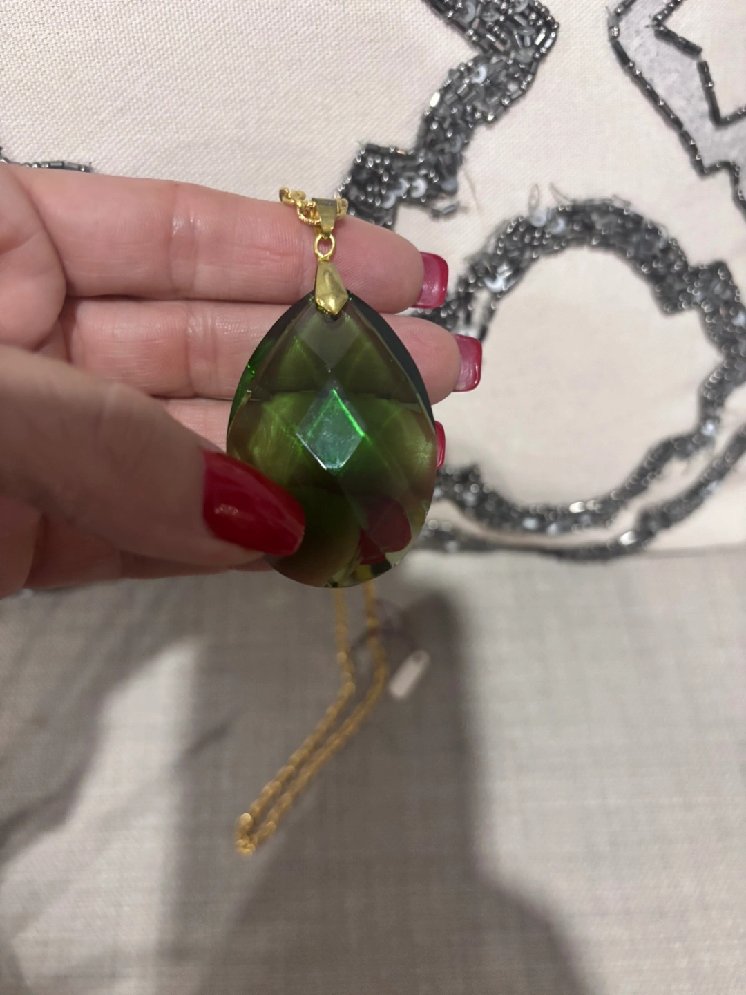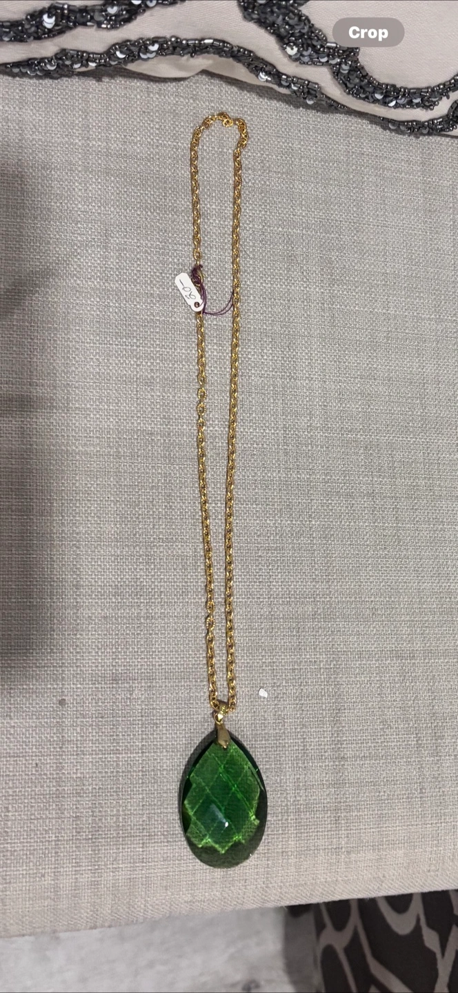 47Elegant Green Teardrop Pendant Necklace — features a faceted glass gemstone in rich emerald green on a gold-tone chain. The pendant catches light beautifully with its diamond-cut finish, making it the perfect statement piece for both casual and evening wear. Lightweight and stylish, this necklace adds a pop of color and sophistication to any outfit. Details: • Pendant size: approx. 2 in (5 cm) drop • Chain length: approx. 14-16 inches • Material: Faceted glass pendant, gold-tone alloy chain • Condition: Excellent, New