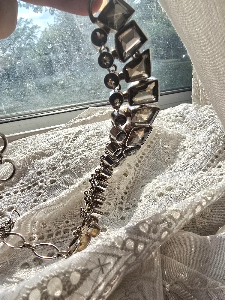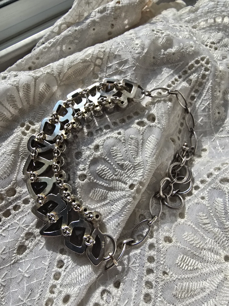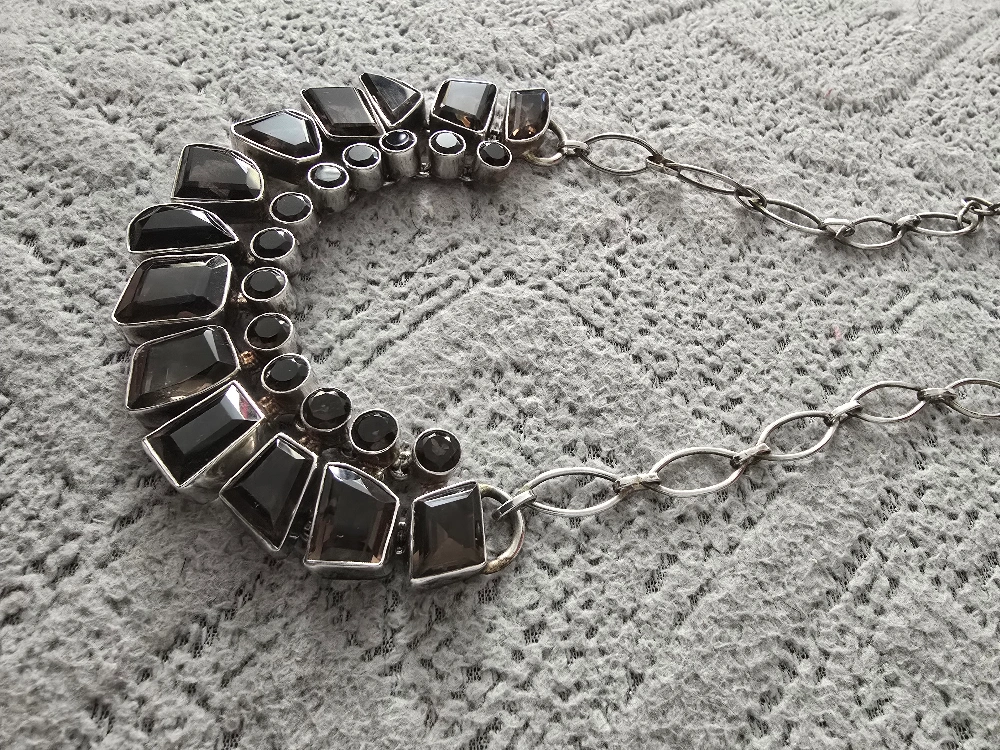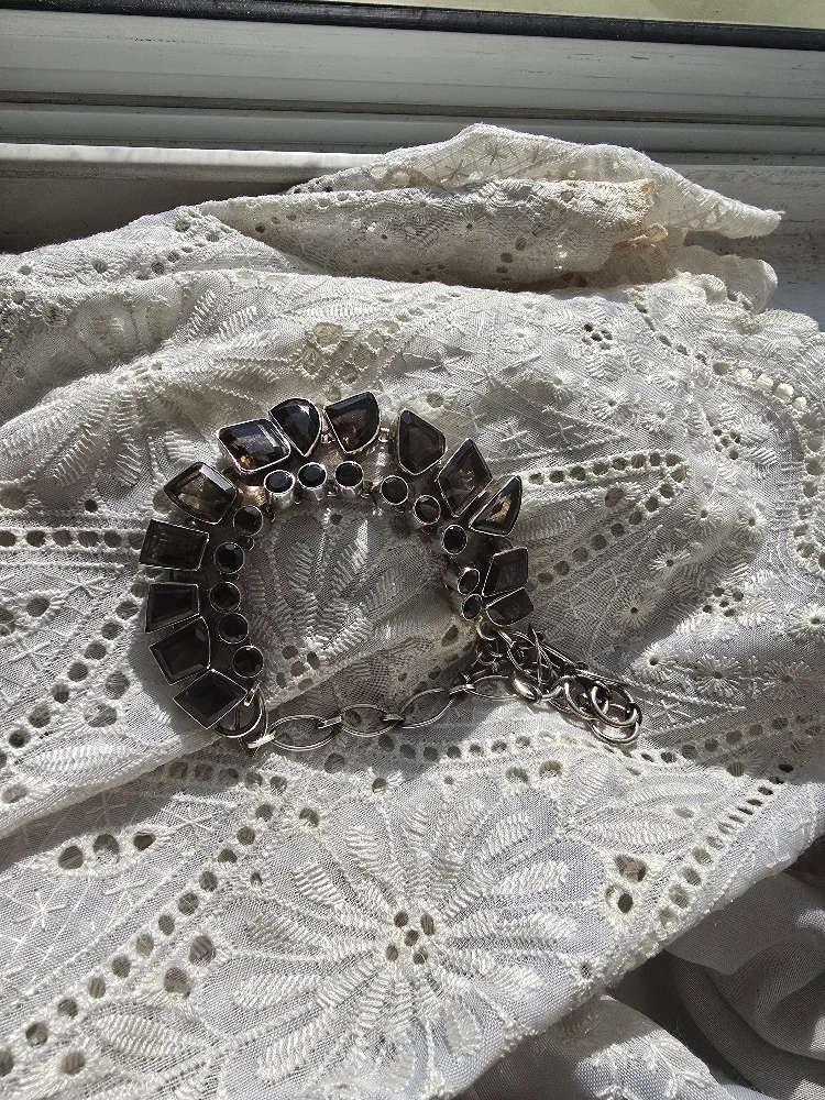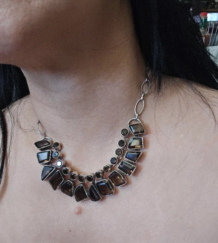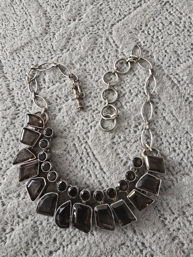 762Here's a Vintage style beautiful necklace featuring faceted smoky quartz stones set in sterling silver. It has a unique design with various shapes of smoky quartz and a sturdy chain. Perfect for adding a touch of elegance to any outfit! It's a statement piece yet not overly done that can't be worn with a tshirt or a dressier outfi. Full weighty Sterling Silver and genuine Smokey Quartz Crystals. Lots of Sterling Silver if you plan to re create your own jewelry and lots of smokey quartz to divide and make rings, pendant and / or earrings. Photos taken under natural light. 📌M1R1S1 near Esso