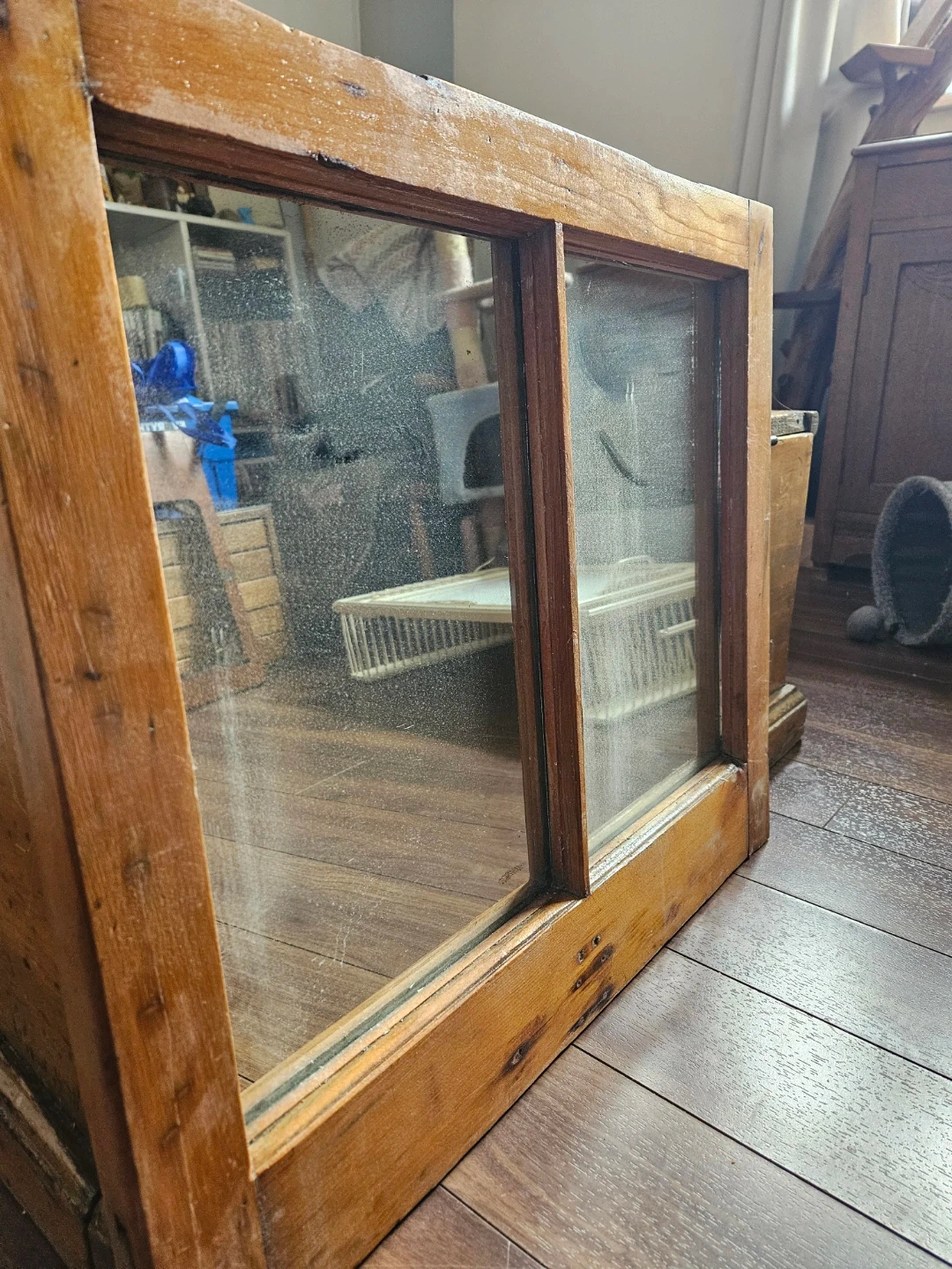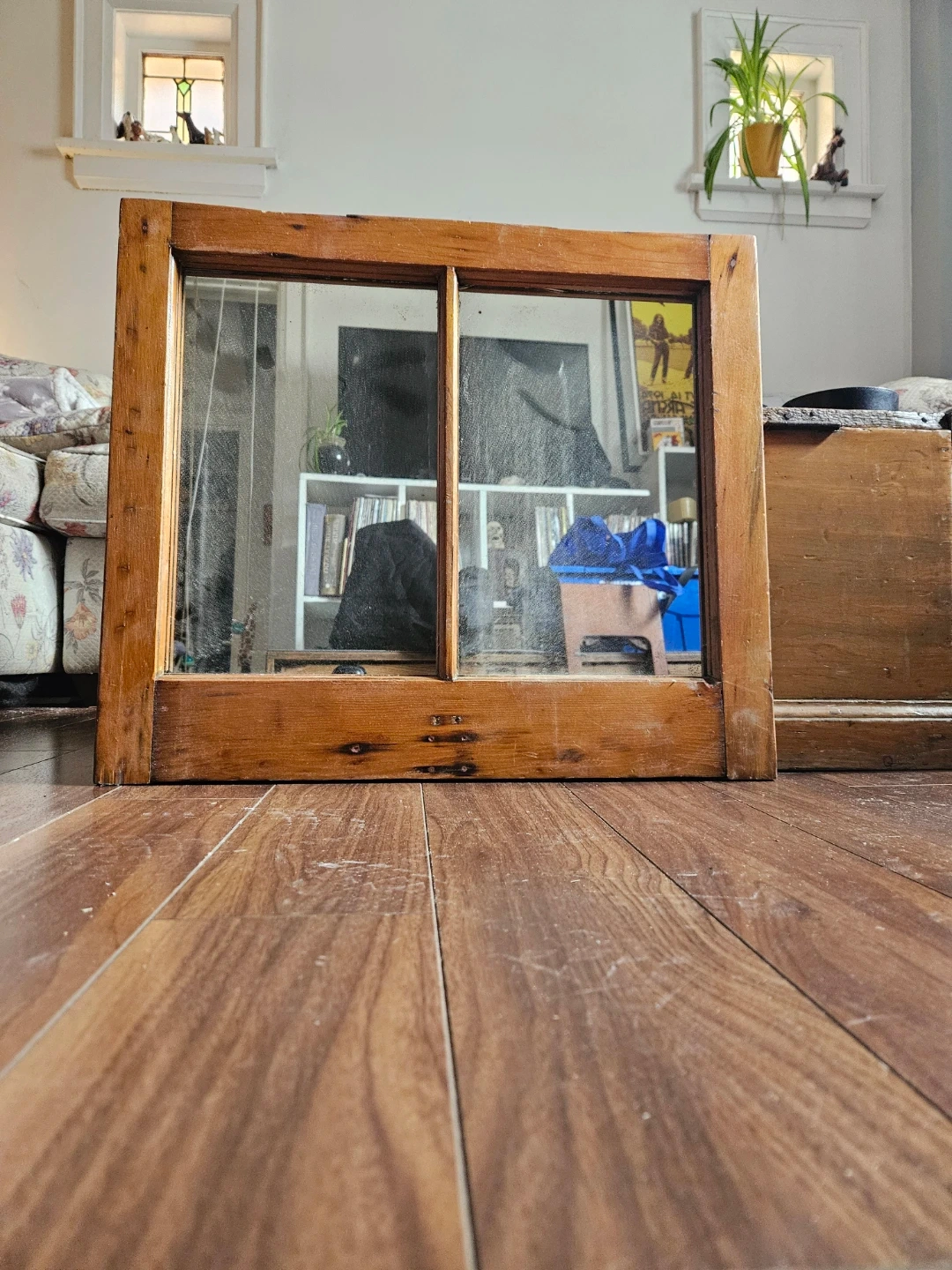 This is a vintage mirror with a wooden frame and two glass panes. The frame appears to be made of pine and has a rustic, unfinished look. It's approximately 24 inches tall and 20 inches wide. A great piece for a DIY project or rustic decor!