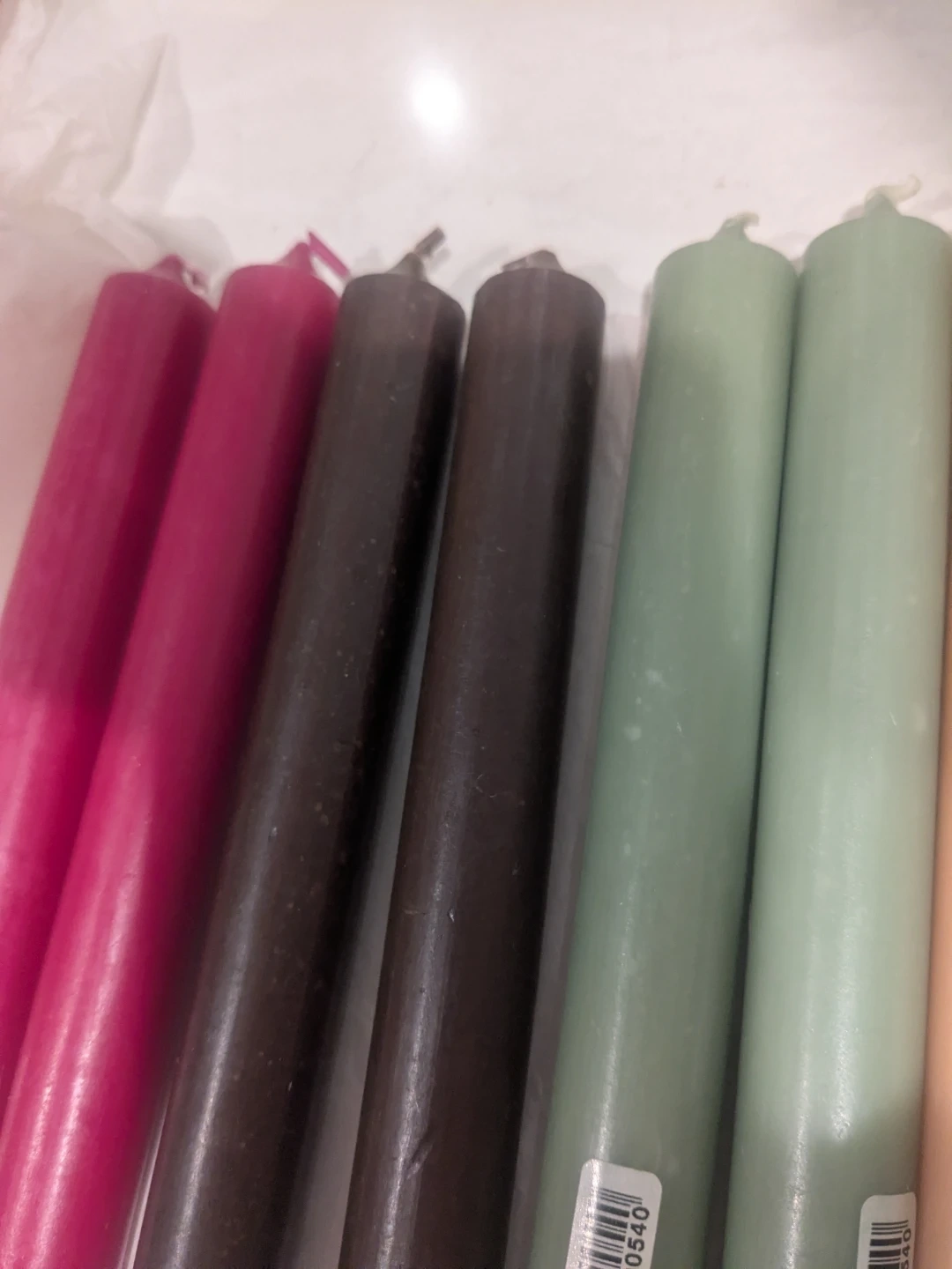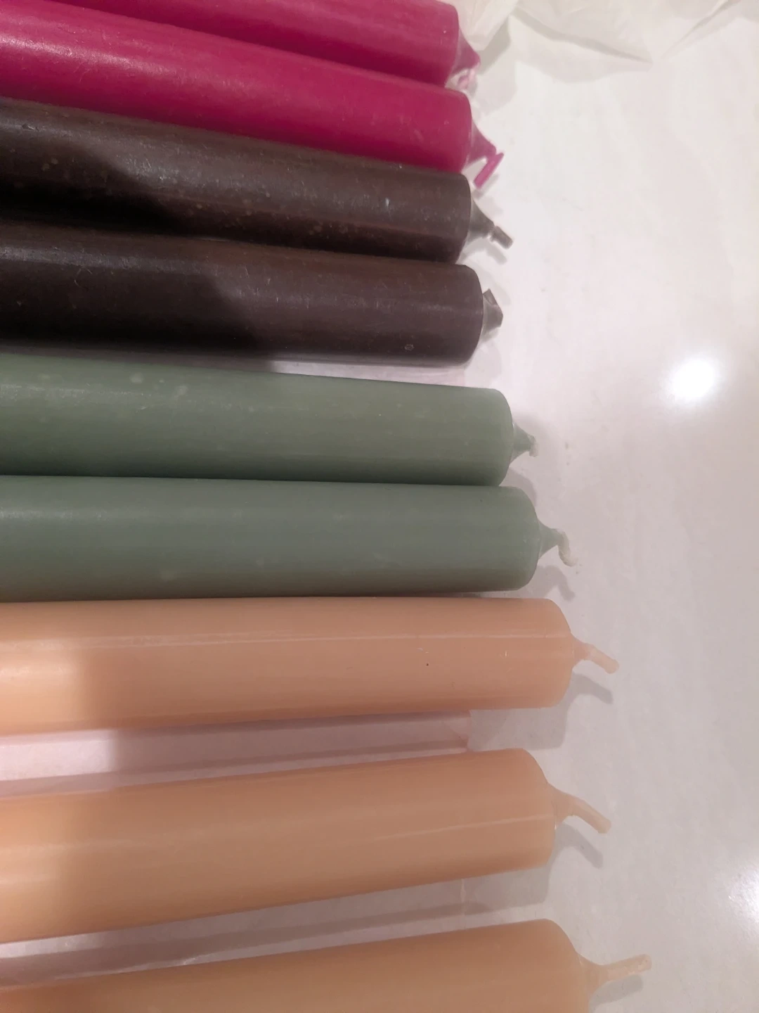 Selling a set of taper candles in assorted colours. There are shades of pink, brown, green and peach. Perfect for adding a touch of warmth to any room