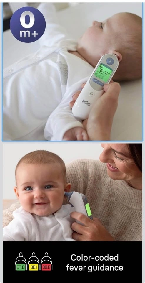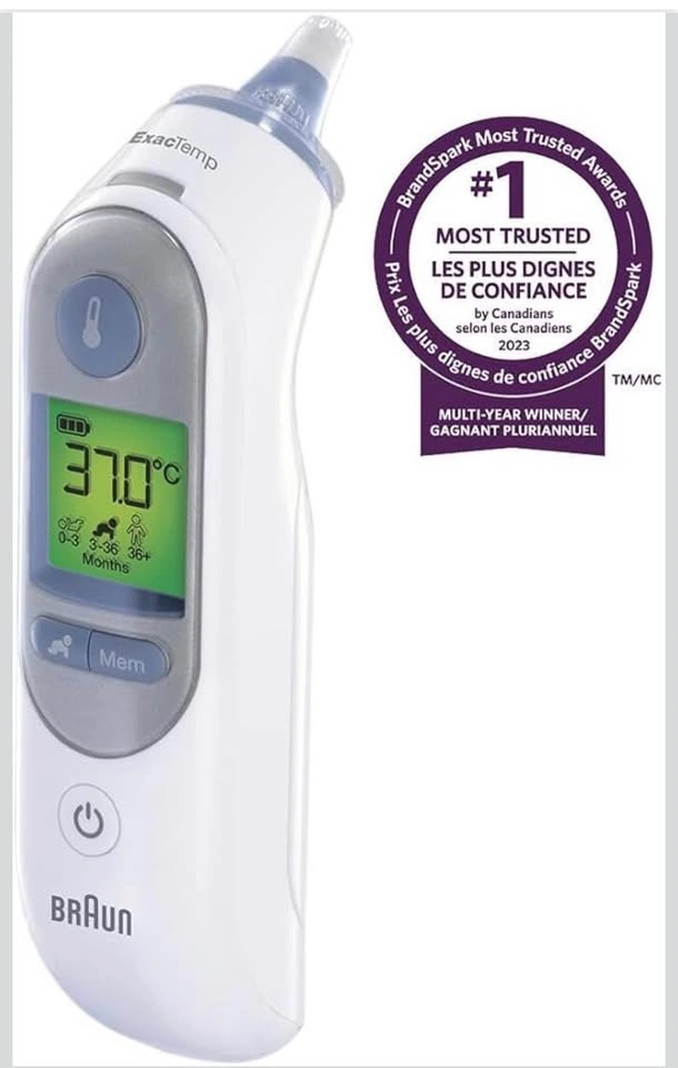 This Braun thermometer is used by many pediatricians and mothers. It's a safe and accurate way to take your child's temperature. The small, soft speculum is ideal for infants, and disposable lens filters help prevent germ transfer. Measures 2 x 6.5 x 1.5 inches (WxHxD); 9.6 ounces. Pick up in Courtice. Please check my other listings!