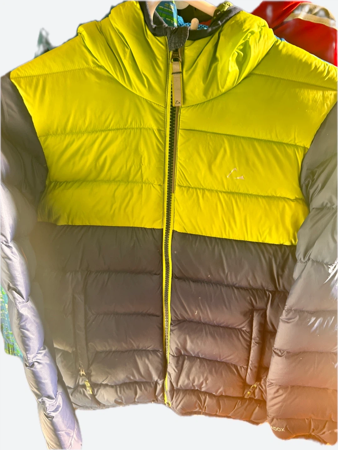 Selling a Land's End puffer jacket in youth size medium. It features a stylish colour block design with yellow, navy, and black. Perfect for keeping warm during the colder months!