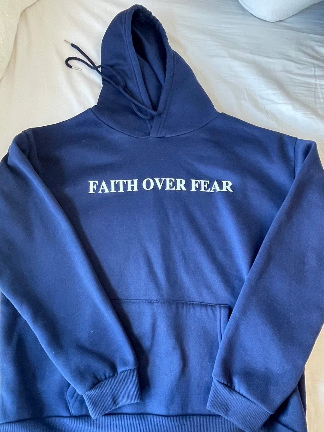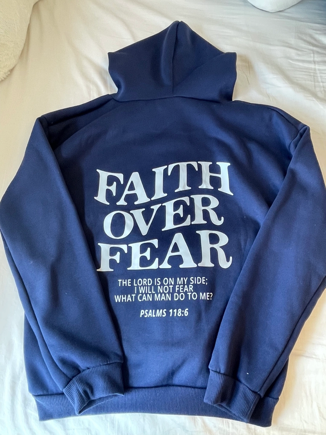 A navy blue hoodie with 'Faith Over Fear' printed on the front and back. The back also includes the text 'THE LORD IS ON MY SIDE; I WILL NOT FEAR. WHAT CAN MAN DO TO ME? PSALMS 118:6'