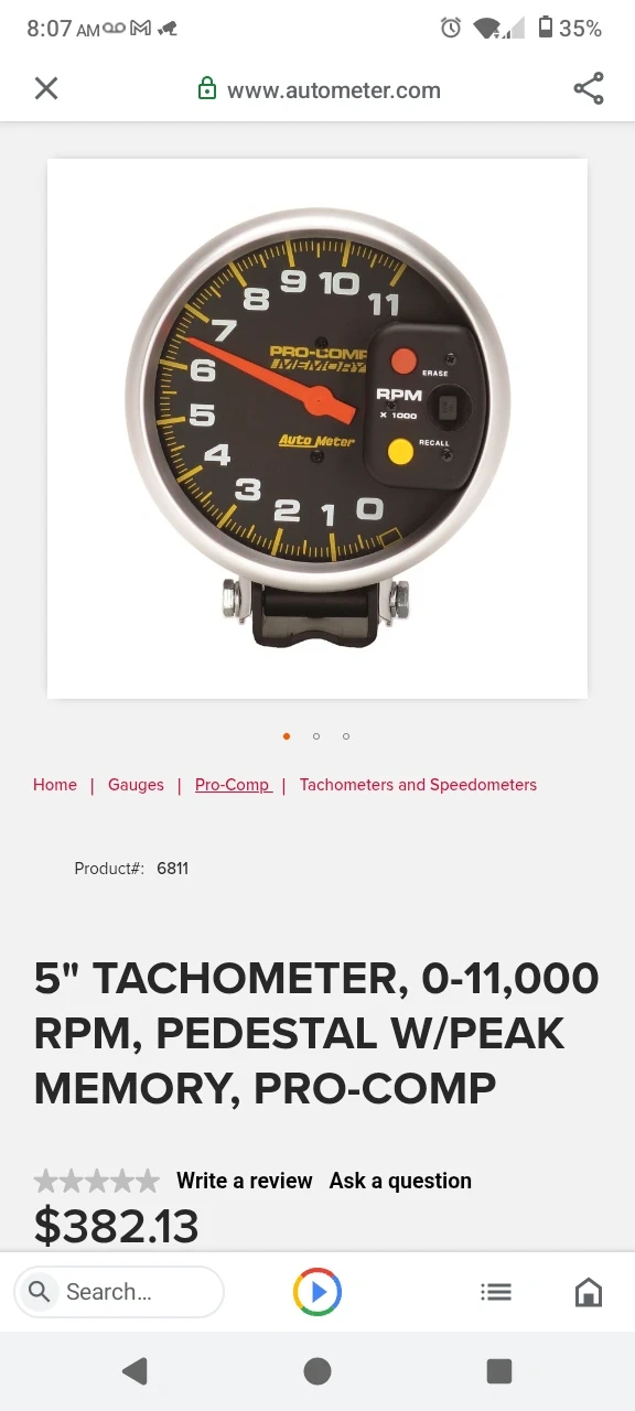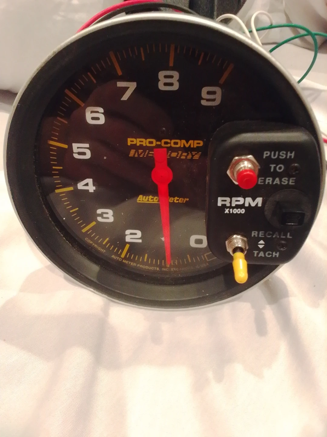 Selling an Auto Meter Pro-Comp 5" Tachometer. It has a 0-11,000 RPM range and a pedestal with peak memory. This tachometer is designed for accurate RPM measurement in automotive applications.