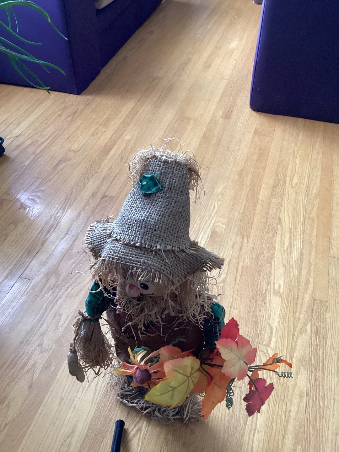 This cute scarecrow decoration is perfect for adding a touch of autumn to your home! It's made with natural materials and has a rustic charm. Bring some seasonal cheer to your space!