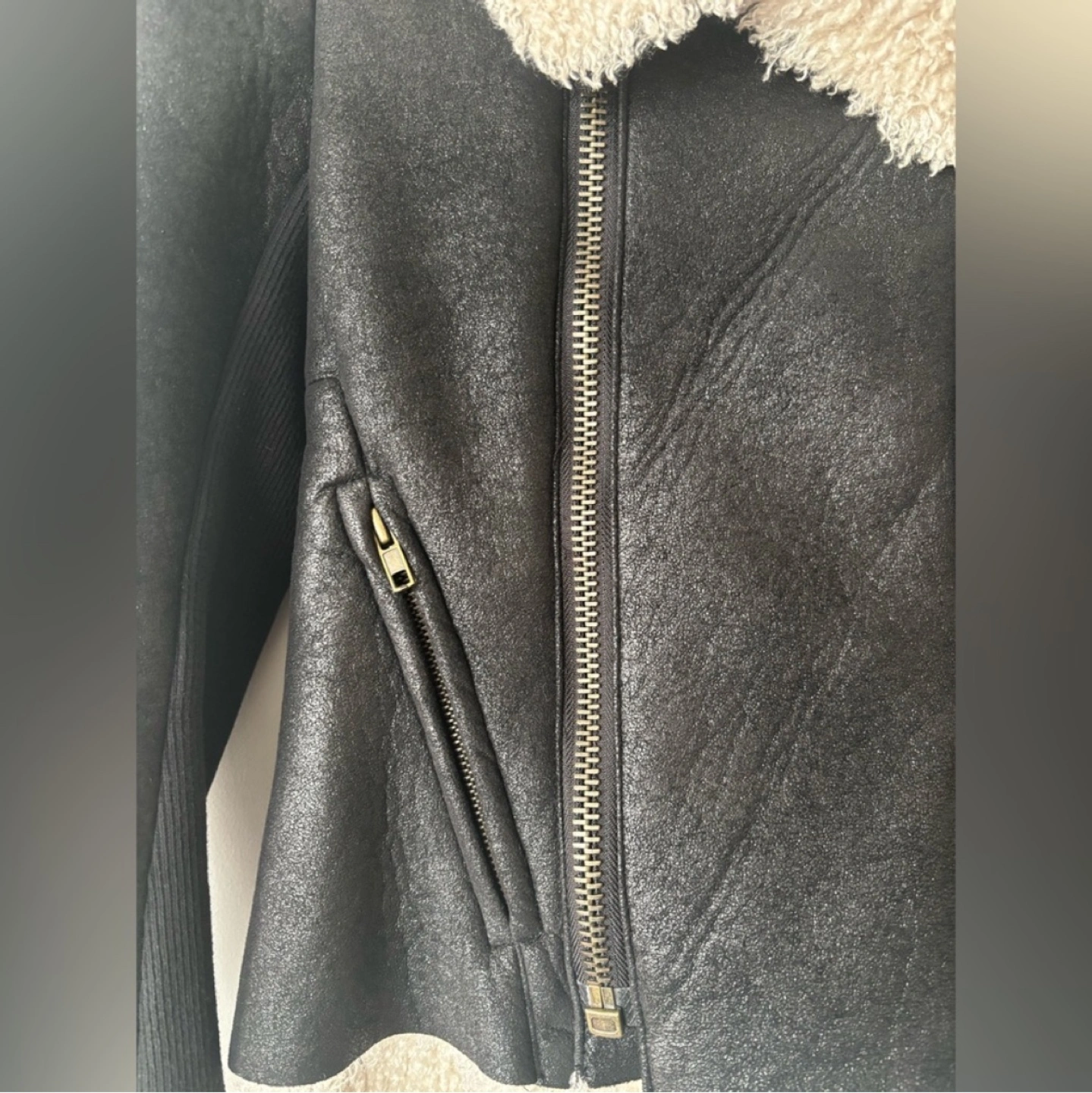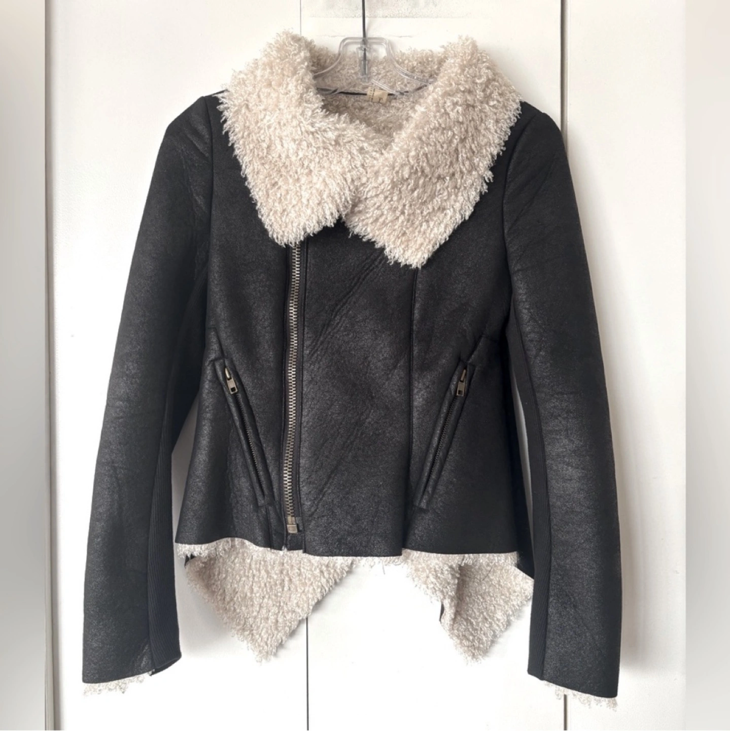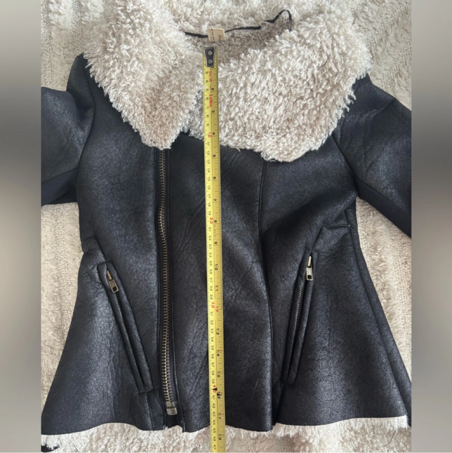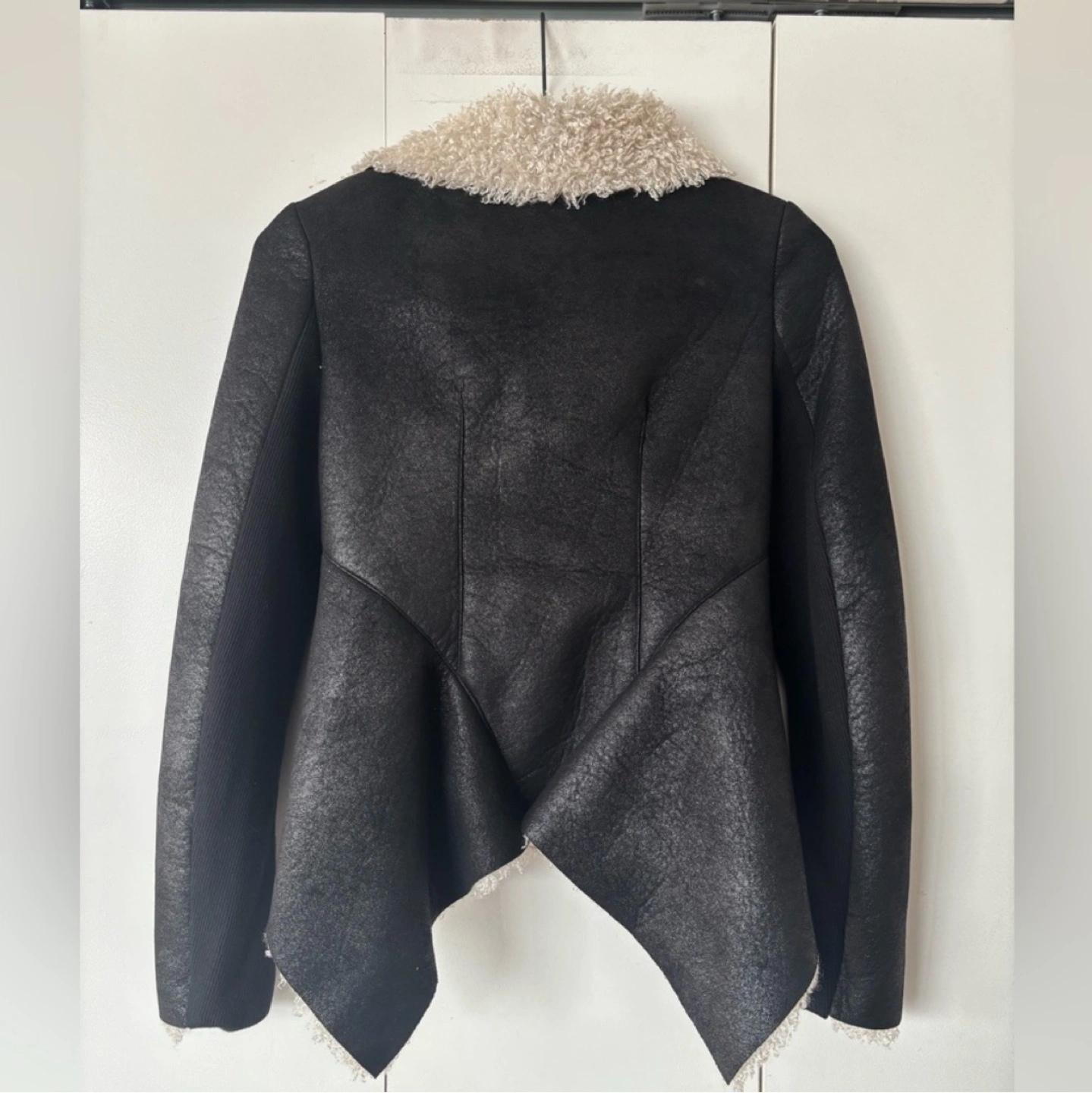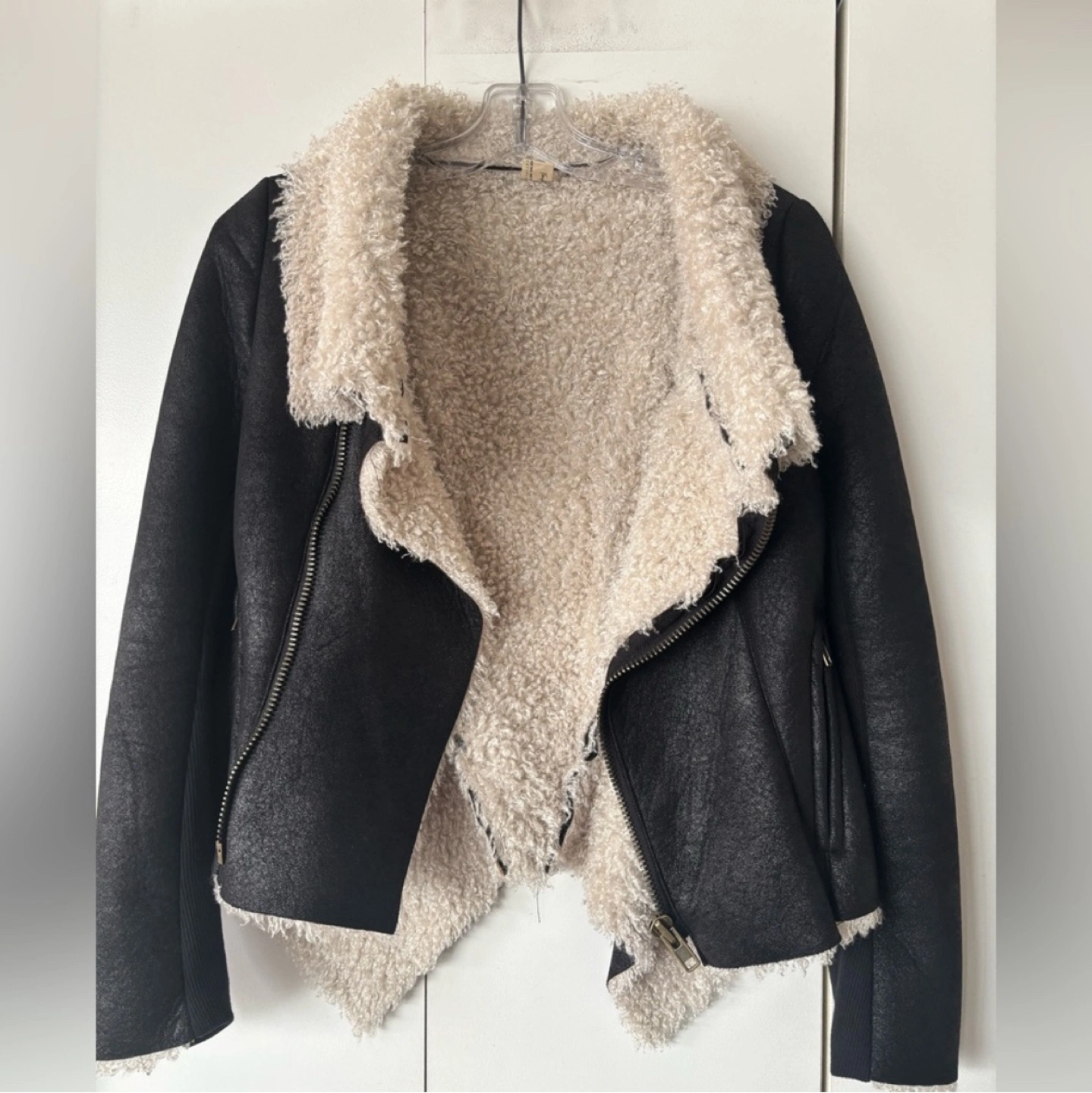69Black faux leather jacket. Asymmetrical hem. Features a cream coloured sherpa collar and lining. Zip closure. Two zippered pockets. Ribbed arm detail. Only worn once.